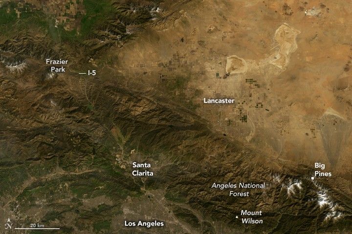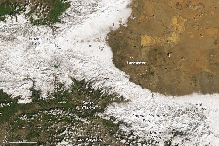 The Operational Land Imager-2 (OLI-2) on Landsat 9 acquired this image (right) of snow blanketing much of the San Gabriel Mountains in areas north of Los Angeles on February 26, 2023. The other image (left) shows the same area on February 10, 2023, before the storm.