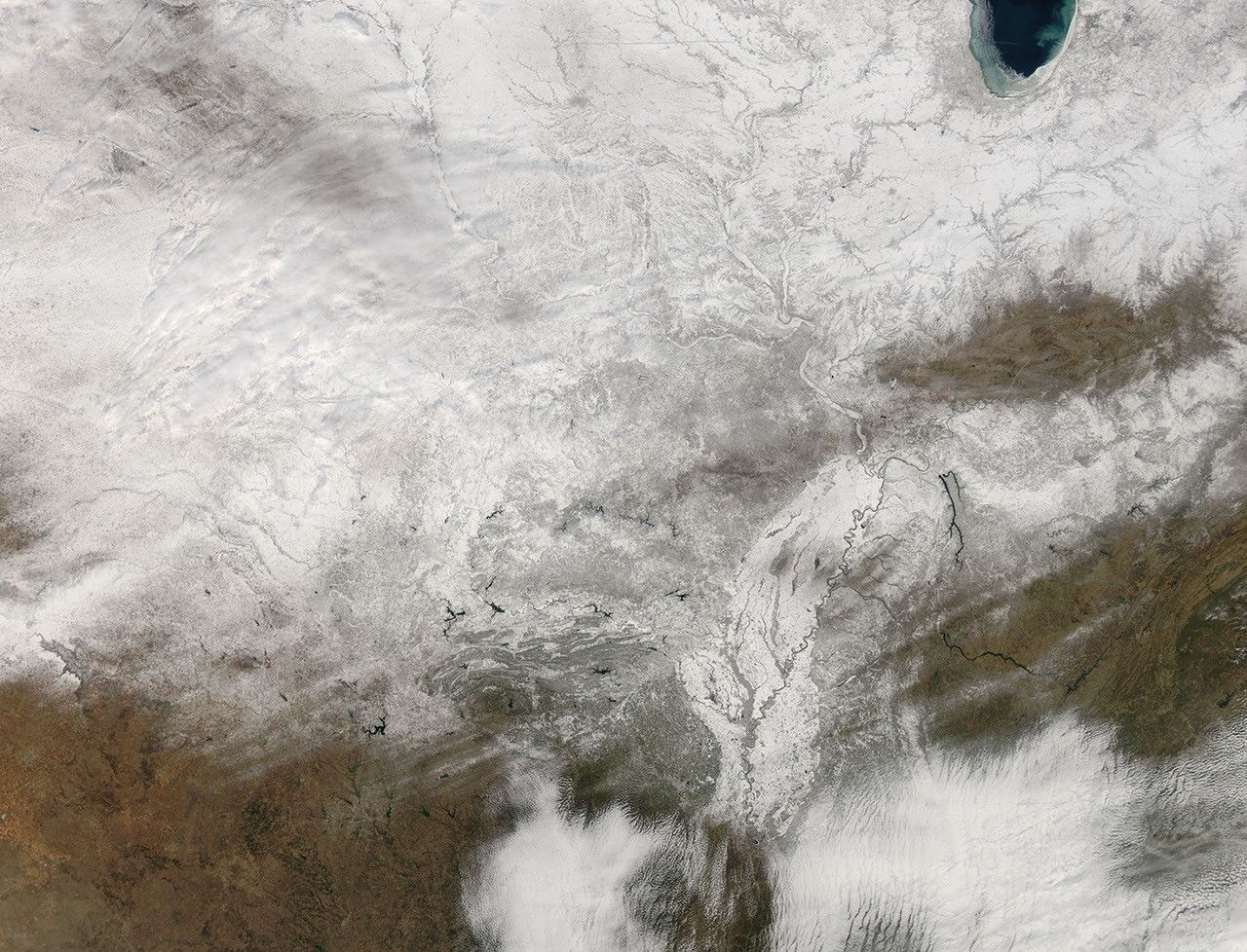 The Moderate Resolution Imaging Spectroradiometer (MODIS) on NASA’s Aqua satellite captured this clear view of the nation's mid-section at 1:25 Central Standard Time on February 10, 2011. Nearly all of the white in this image is snow and ice, except for a bit of clouds in the lower right (southeast) corner. In the larger image file, the outlines of the Ouachita and Ozark mountain ranges darken the snowy landscape, while river valleys such as the Mississippi appear brighter due to fewer trees. Gray-white areas are often developed, urban landscapes that have been coated by snow; some, however, are just rural areas that received less snow.