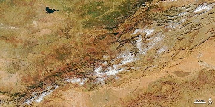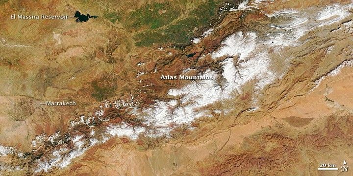 Snow cover in the Atlas Mountains serves more than Morocco’s ski industry. The snow provides a crucial reservoir of water for the country’s agriculture-based economy. Monitoring snowfall in this region is the subject of ongoing interest, in part because precipitation is uneven and evaporation rates are high.