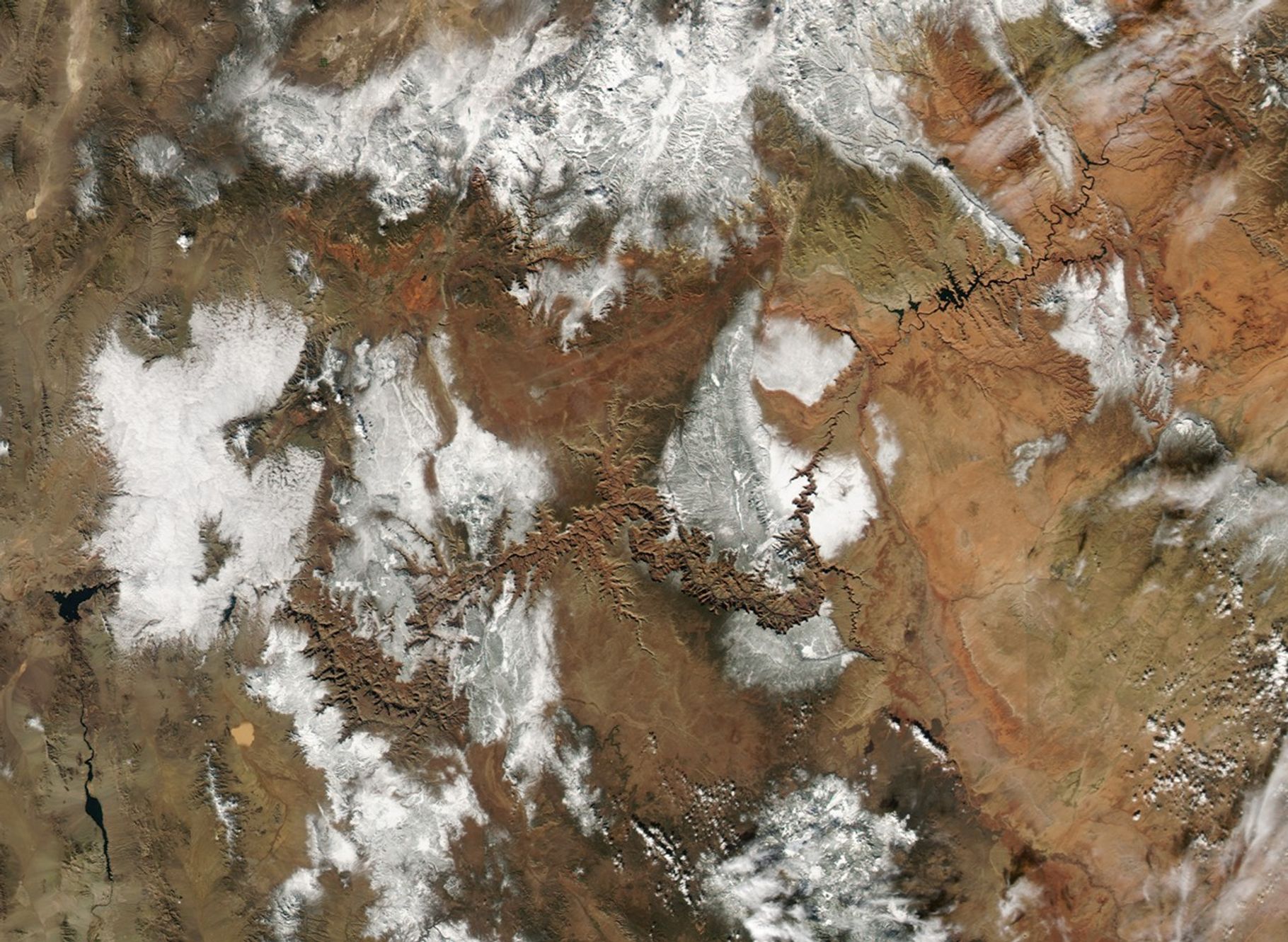 Snow across the burnt-orange rock of the Colorado Plateau makes the rugged topography of the Grand Canyon of the Colorado River leap out from the center of this image captured by the Moderate Resolution Imaging Spectroradiometer (MODIS) sensor on NASA’s Aqua satellite on November 23, 2004.