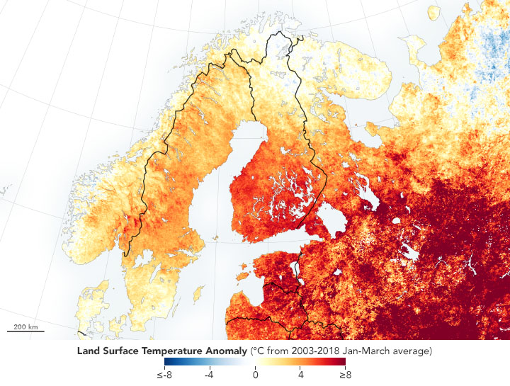The map above shows land surface temperature anomalies for January to March 2020 in northern Europe. Orange and red colors indicate areas that were warmer than average for the same three-month period from 2003 to 2018. The map is based on MODIS data from NASA’s Aqua satellite. Note that the map depicts land surface temperatures (LSTs), not air temperatures. LSTs are a measure of how hot the surface would feel to the touch and can sometimes be significantly hotter or cooler than air temperatures.