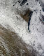 A swath of white defines the path of the storm from Minnesota to Kentucky in the image. Cloud streets streak across Lake Superior and Lake Michigan. Such clouds form when cold, dry air blows over the lakes. The moist air from the lakes freezes, forming long lines of clouds that echo the flow of the wind. The same process creates lake-effect snow, which was reported south and east of the lakes. The snow in northern Wisconsin and Michigan is likely lake effect snow off Lake Superior.