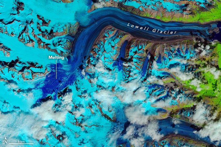 Pelto has seen similar puddles of slush on other glaciers, but the rapid development of such a large melt area on Lowell Glacier is unusual. “The only way to generate such an extensive snow swamp is to have the snow saturated with water all the way to the surface,” he said.
