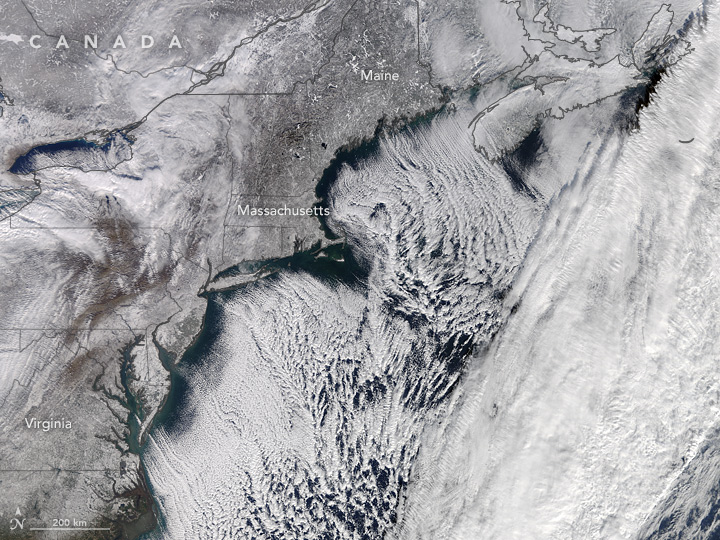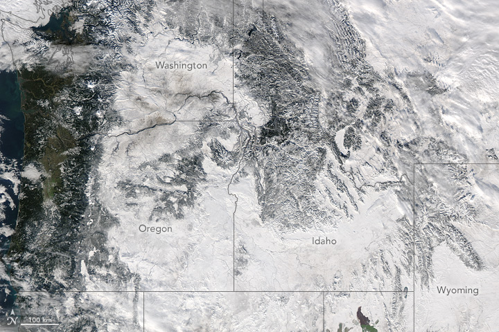 The images below, captured in the same week as the image above by the Moderate Resolution Imaging Spectroradiometer (MODIS) on NASA’s Aqua and Terra satellites, show snow blanketing the Pacific Northwest as well as the East Coast.