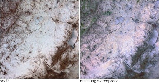 In the nadir image, vegetation appears in shades of red, owing to its high near-infrared reflectivity. In the multi-angle composite, open-canopy forested areas are indicated by green hues. Since this is a multi-angle composite, the green color arises not from the color of the leaves but from the architecture of the surface cover. The green areas appear brighter at the nadir angle than at the oblique angles because more of the snow-covered surface in the gaps between the trees is visible. Color variations in the multi-angle composite also indicate angular reflectance properties for areas covered by snow and ice. The light blue color of the frozen lakes is due to the increased forward scattering of smooth ice, and light orange colors indicate rougher ice or snow, which scatters more light in the backward direction.