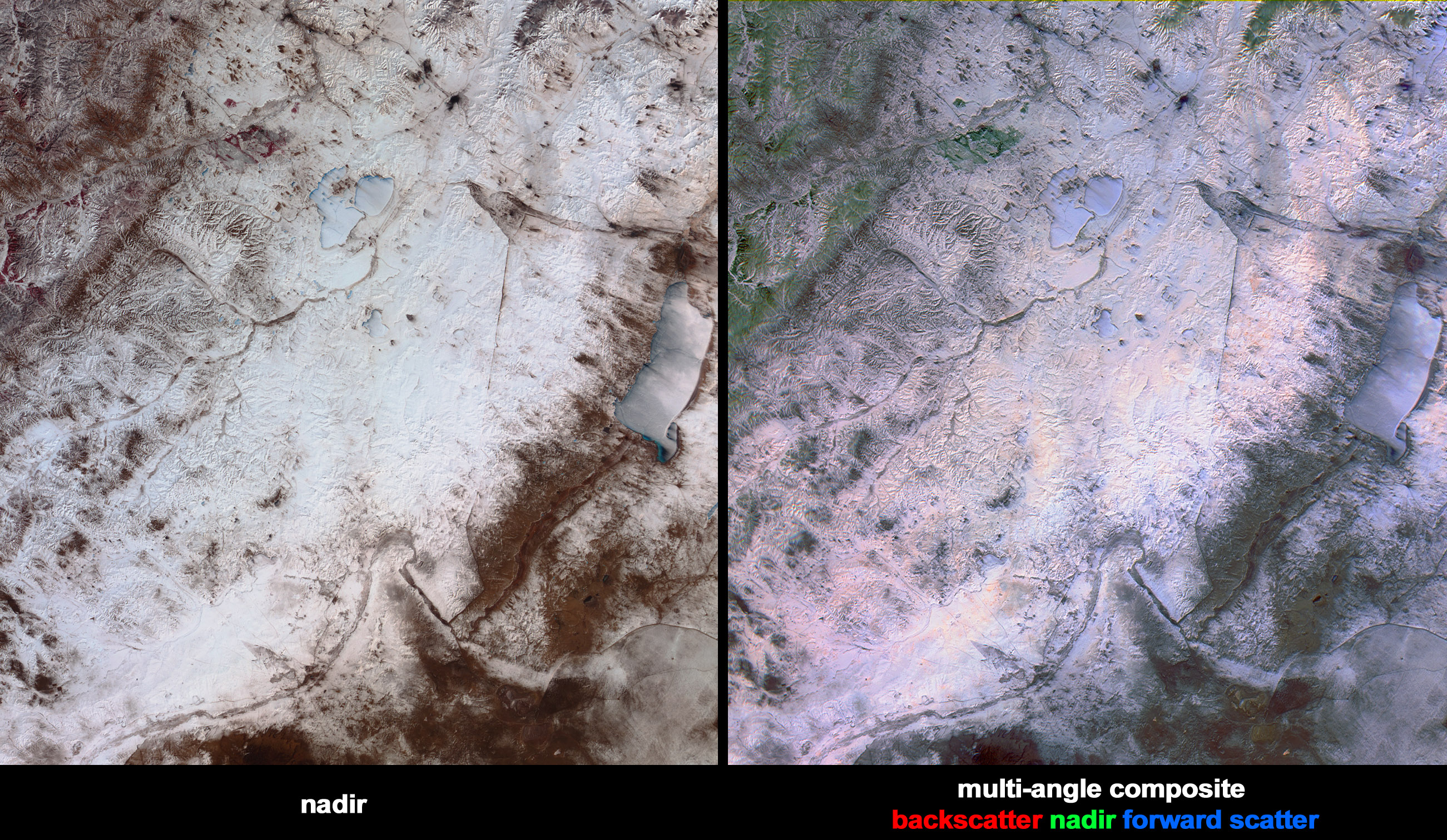 In the nadir image, vegetation appears in shades of red, owing to its high near-infrared reflectivity. In the multi-angle composite, open-canopy forested areas are indicated by green hues. Since this is a multi-angle composite, the green color arises not from the color of the leaves but from the architecture of the surface cover. The green areas appear brighter at the nadir angle than at the oblique angles because more of the snow-covered surface in the gaps between the trees is visible. Color variations in the multi-angle composite also indicate angular reflectance properties for areas covered by snow and ice. The light blue color of the frozen lakes is due to the increased forward scattering of smooth ice, and light orange colors indicate rougher ice or snow, which scatters more light in the backward direction.