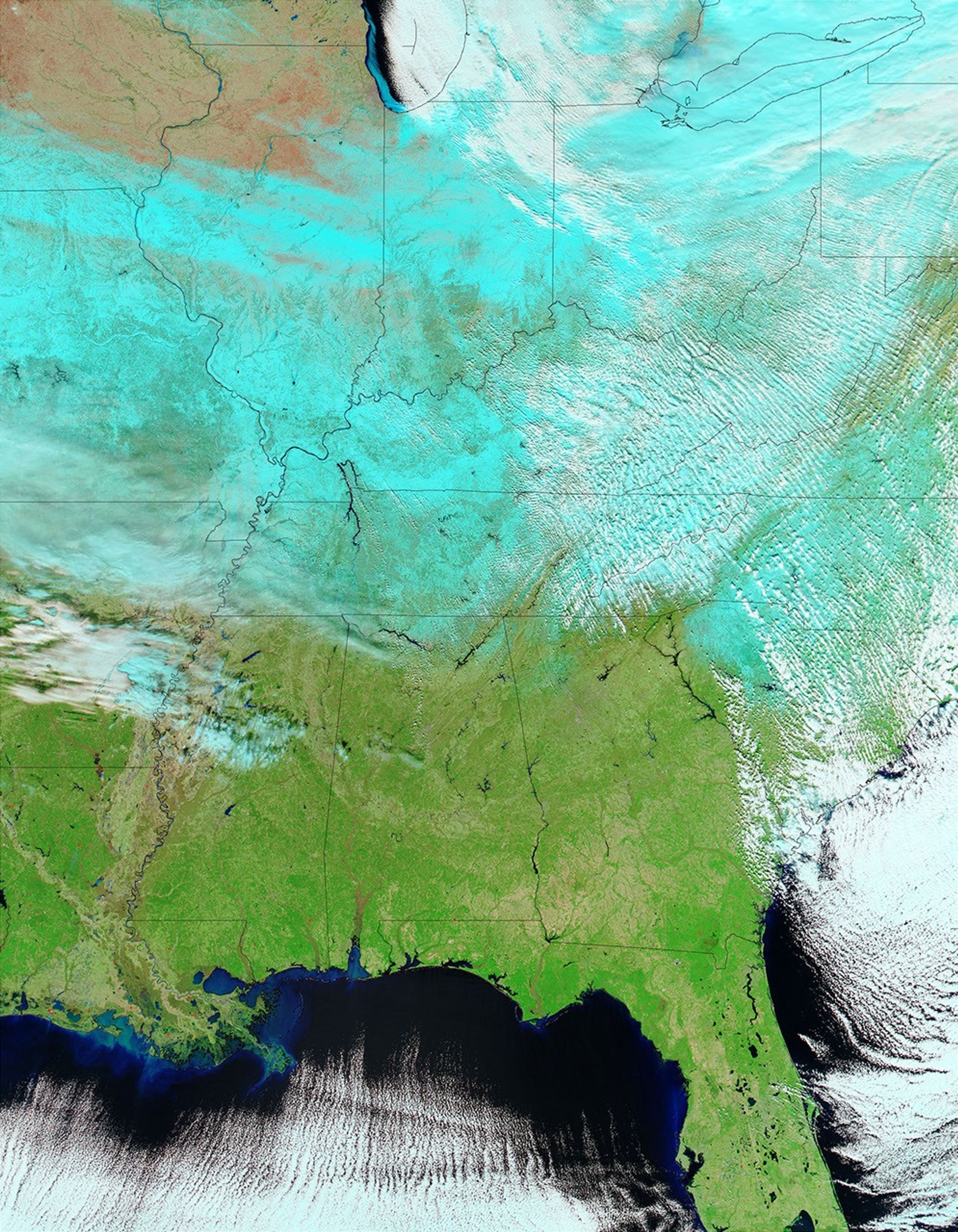 This false-color image was acquired on Jan. 23 by the Moderate Resolution Imaging Spectroradiometer (MODIS) aboard NASA's Aqua satellite. Blue hues indicate snow-coverd land and white areas are clouds. The high-resolution image available here is 500 meters per pixel. Visit the MODIS Rapid Response Team, for a copy of this scene at MODIS' full resolution of 250 meters per pixel.