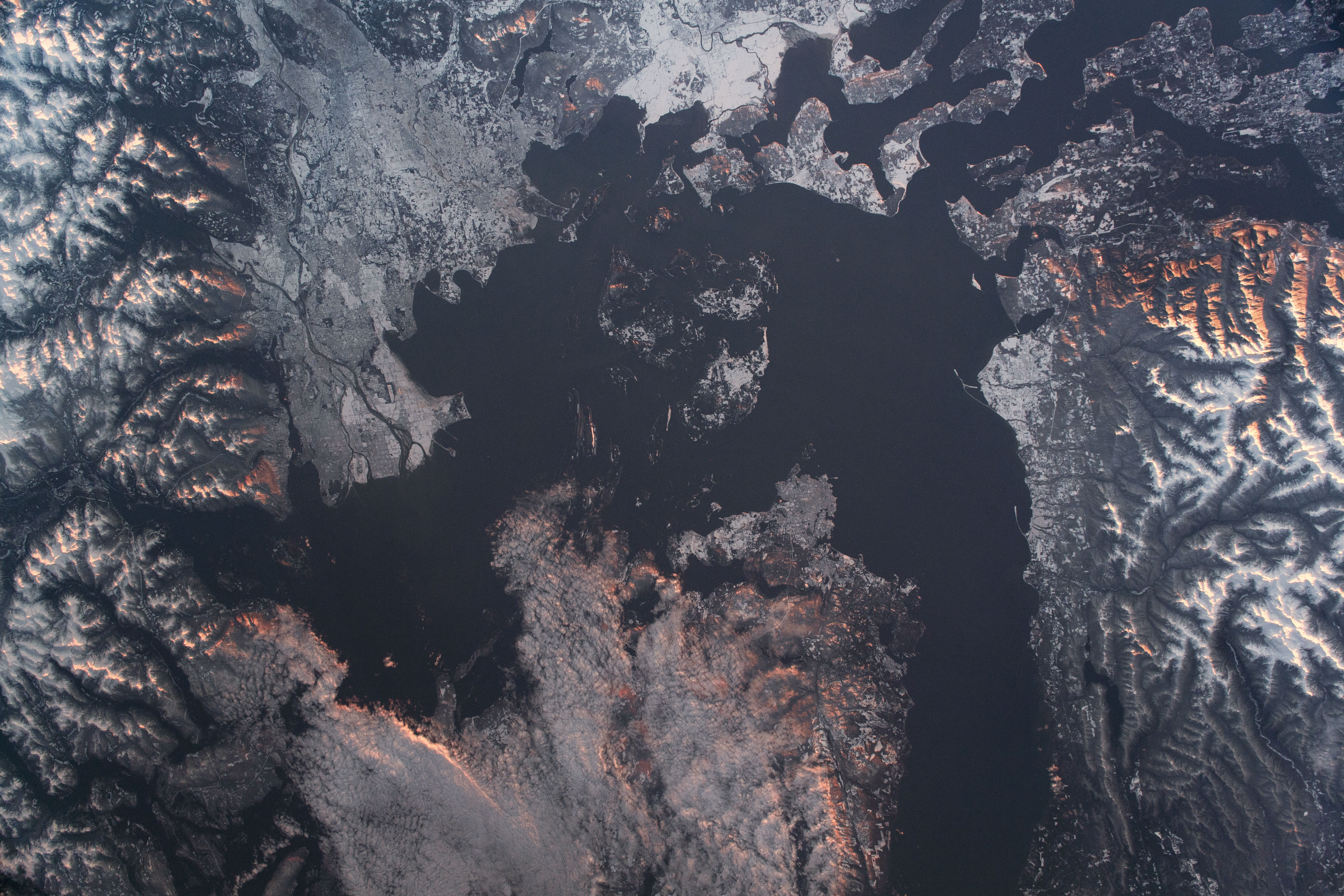 While the people of the Pacific Northwest were waking up to freshly fallen snow, an astronaut photographed this sunrise view of the state of Washington (United States) and the province of British Columbia (Canada). Cities, towns, and islands around the Salish Sea were blanketed in snow. Clouds and mountain peaks were illuminated by the rising Sun’s warm hues.