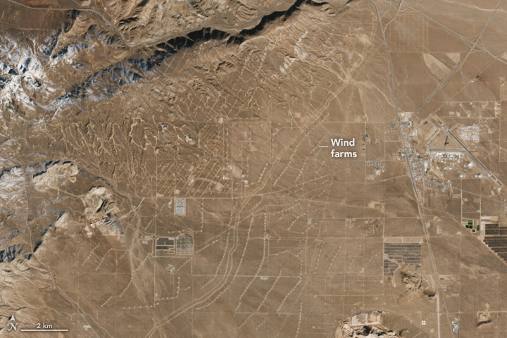 This corner of the desert is a hotbed not only for solar but also for wind energy. Rows of wind turbines, connected by both straight and sinuous access roads, are visible in the stretch of desert northwest of the solar-plus-storage project (above). This image was also acquired by the OLI-2 on Landsat 9 on January 12, 2024.