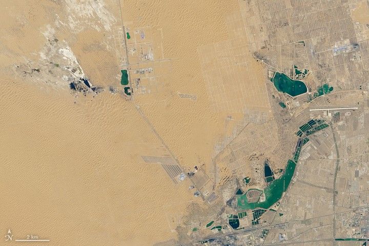 This pair of Landsat 8 images highlights the rapid expansion of the Tengger Desert facility. The Operational Land Imager (OLI) acquired the left image in April 2013—when just a few solar panels stood in the southern part of the facility—and the right image in April 2019.
