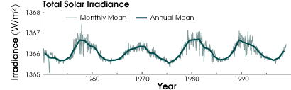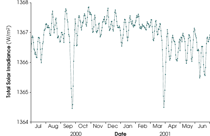 If that were all there was to the Earth’s radiative balance, scientists studying the Sun would have probably long since moved on to another climate-related problem. Analyzing the Sun and its affects on climate, however, is further complicated by the fact that the amount of radiation arriving from the Sun is not constant. It varies from the average value of the TSI—1,368 W/m2—on a daily basis.