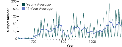 Another trend scientists have picked up on appears to span several centuries. Late 17th century astronomers observed that no sunspots existed on the Sun’s surface during the time period from 1650 to 1715 AD. This lack of solar activity, which some scientists attribute to a low point in a multiple-century-long cycle, may have been partly responsible for the Little Ice Age in Europe. During this period, winters in Europe were much longer and colder than they are today. Modern scientists believe that since this minimum in solar energy output, there has been a slow increase in the overall sunspots and solar energy throughout each subsequent 11-year cycle.