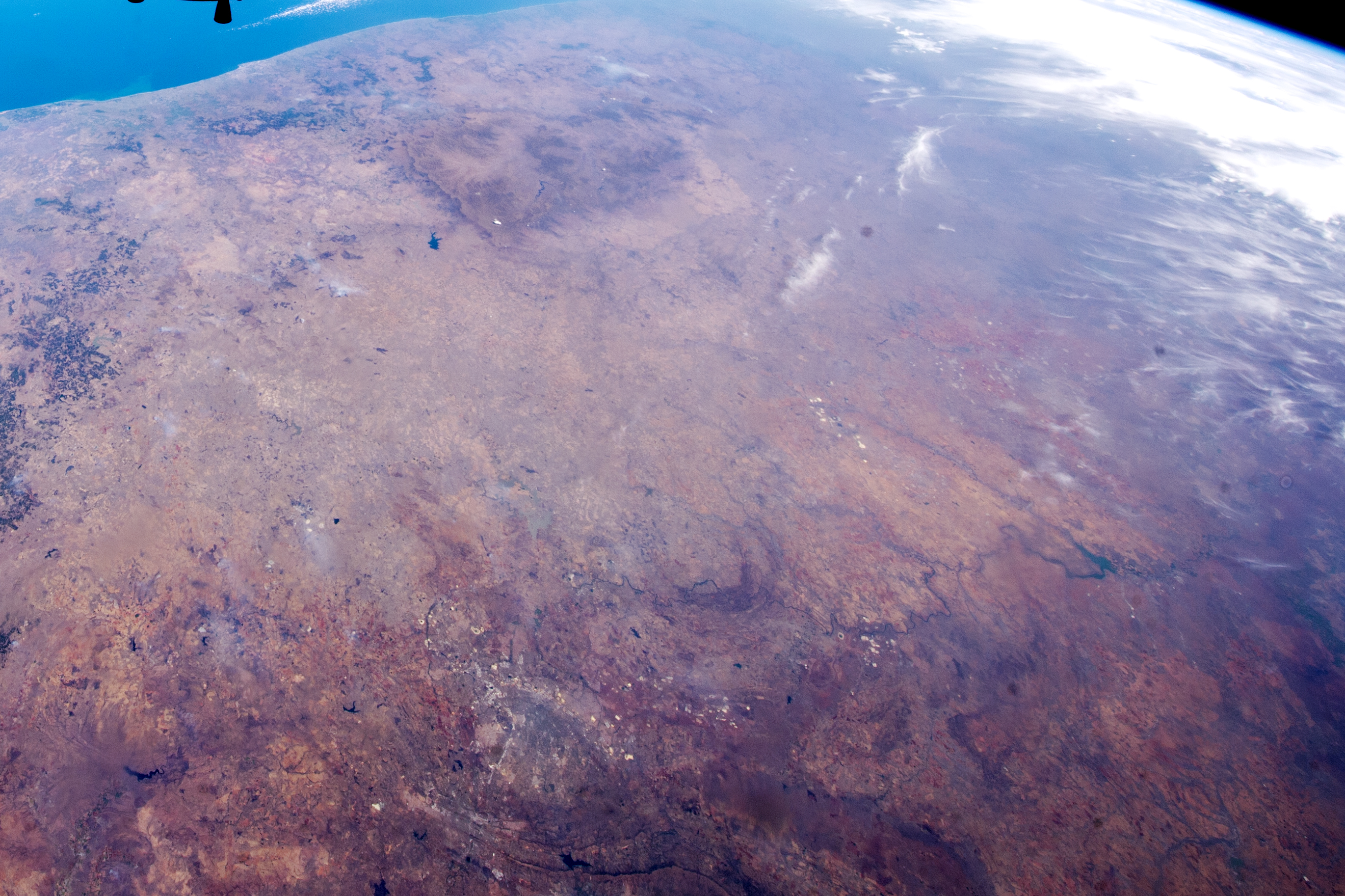 An astronaut aboard the International Space Station (ISS) looked toward the horizon as the spacecraft sped across southern Africa. The crew member used a short lens that mimics closely what the human eye sees—in this case, a big panorama from a point over northern South Africa, looking southeast to the Indian Ocean.