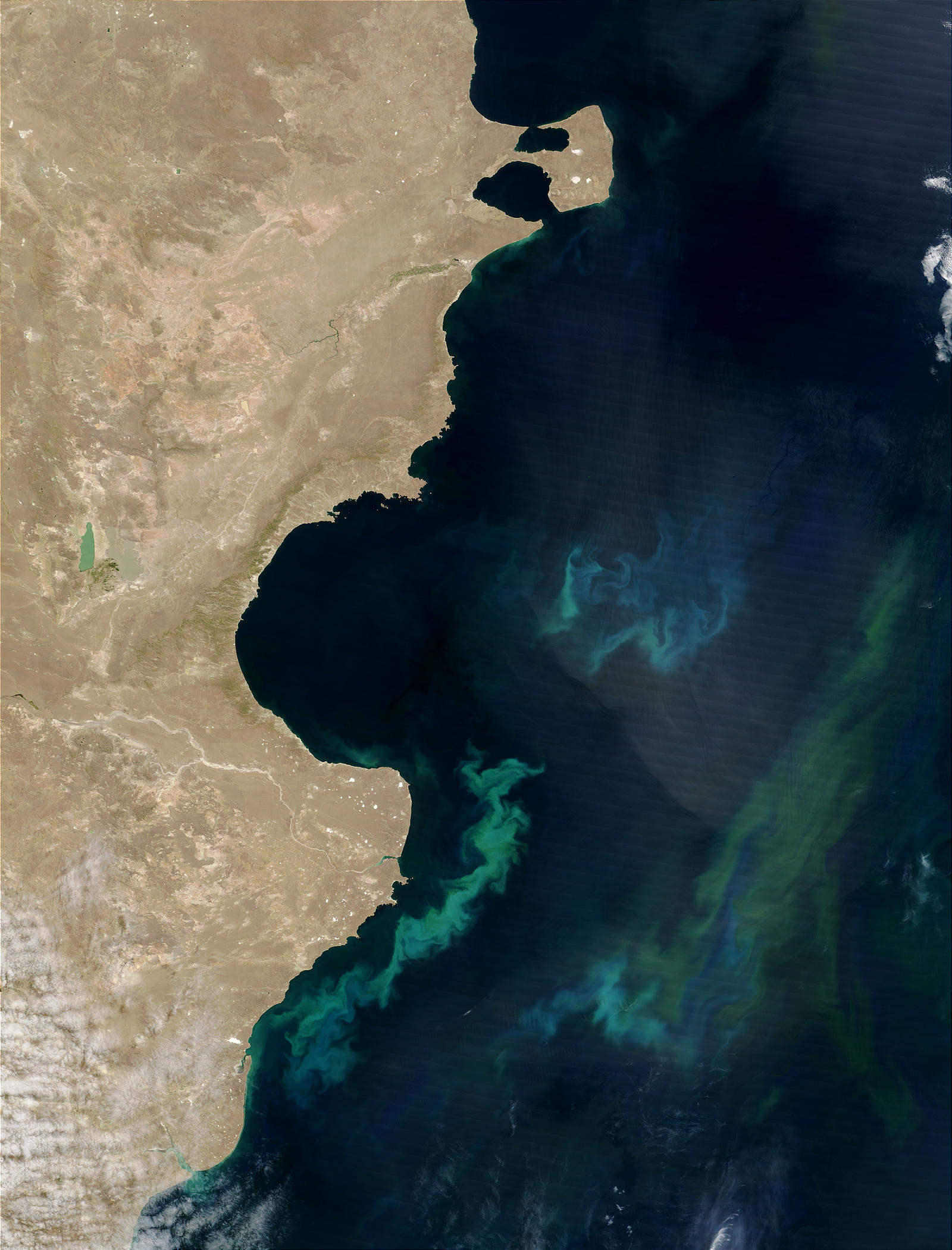 Off the east coast of Argentina, the South Atlantic Ocean is blooming with color. This true-color Moderate Resolution Imaging Spectroradiometer (MODIS) image from the Terra satellite on February 10, 2003, shows the waters off southern Argentina swirling with the blues and greens that indicate massive amounts of microscopic marine plants called phytoplankton. The blues and greens are caused by sunlight reflecting off the chlorophyll contained in the tiny, often single-celled plants.