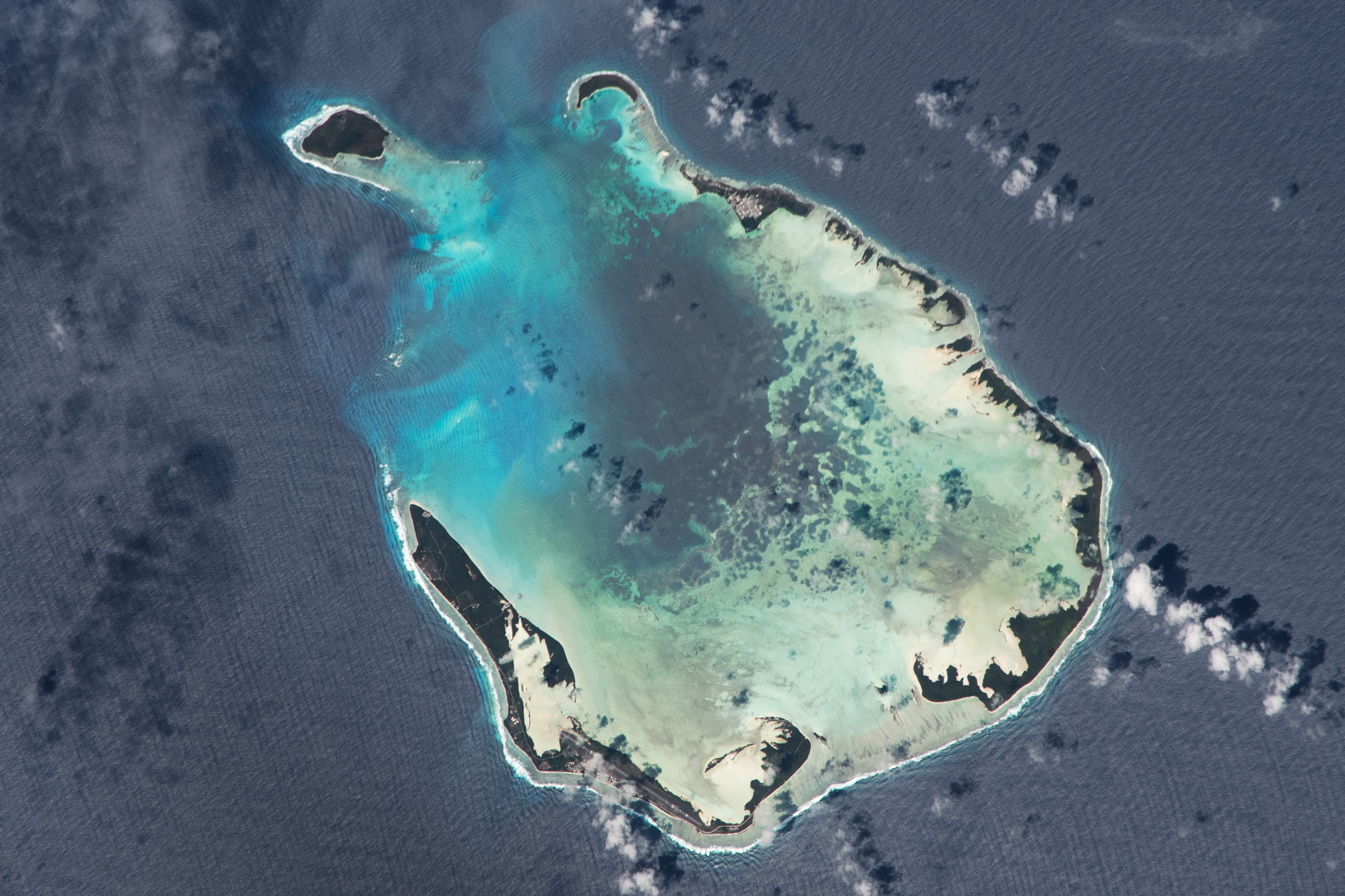 About 600 people live on two of South Keeling’s islets. Bantam Village, the atoll’s largest town, is located on Home Island. The other inhabited island, West Island, is long enough to support an airstrip, which is slightly obscured by clouds in this scene.