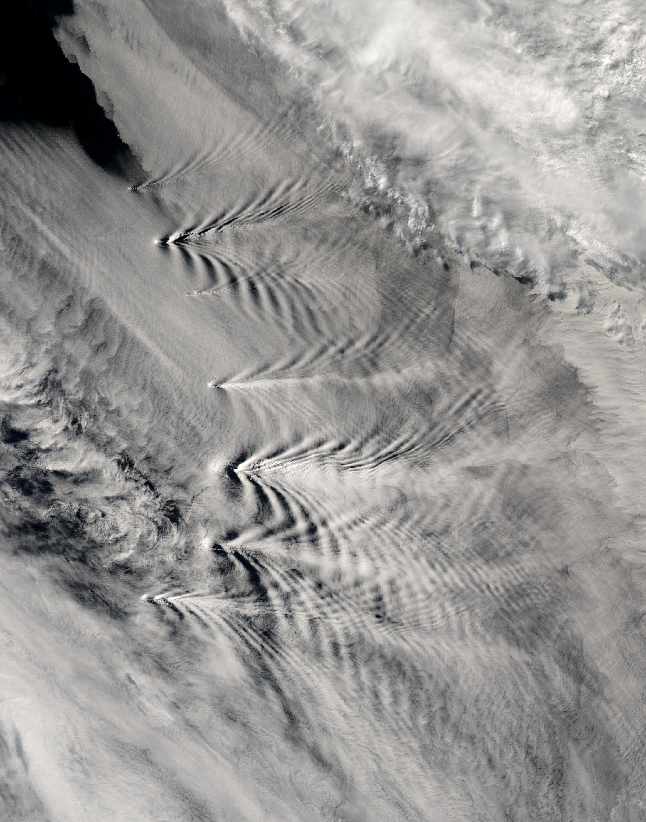 As is apparent in this true-color image, the islands are tall enough to disrupt the cloud patterns forming and flowing around them. Most of this scene is dominated by a large formation of low-level stratiform clouds that appears to be flowing in a southeasterly direction (from upper left to lower right). However, appearances can be deceiving, as the wake patterns extending due eastward from each of the islands suggest that the air mass is moving to the east. Alternatively, it is possible that there are two air masses moving in slightly different directions—a lower wind pattern moving due east with a slightly higher wind pattern moving southeast.