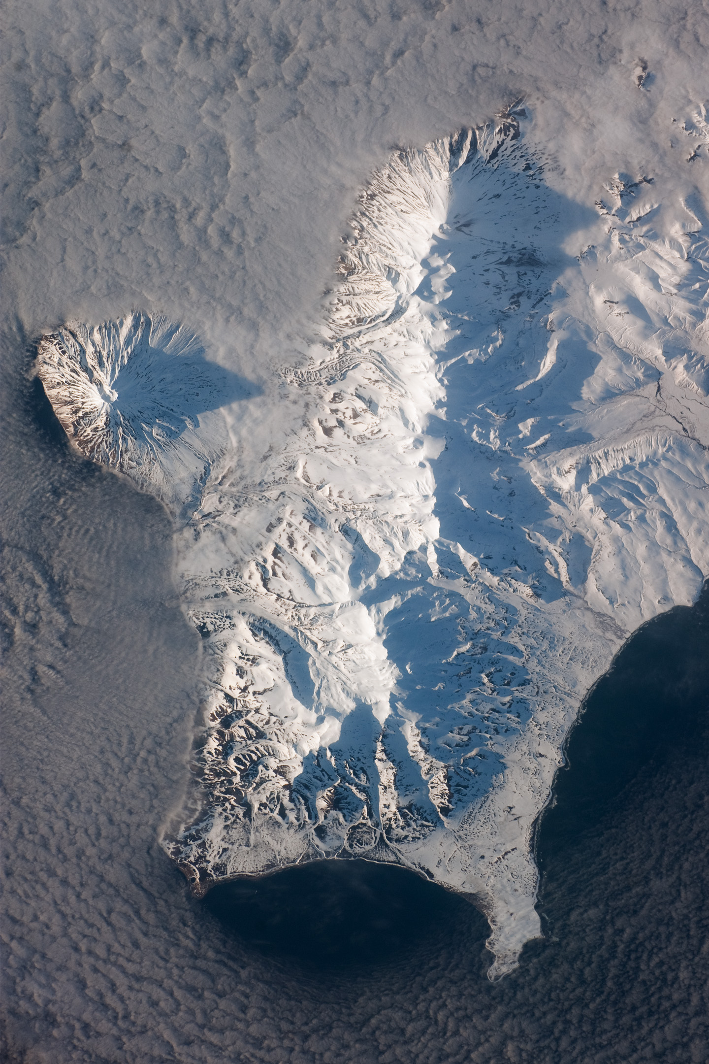 Paramushir Island in the northern Kurils is an example of a large island built by several volcanoes over geologic time. This astronaut photograph shows the southern end of Paramushir Island after a snowfall. The western slopes of the mountains are brightly illuminated, while the eastern slopes are in shadow.