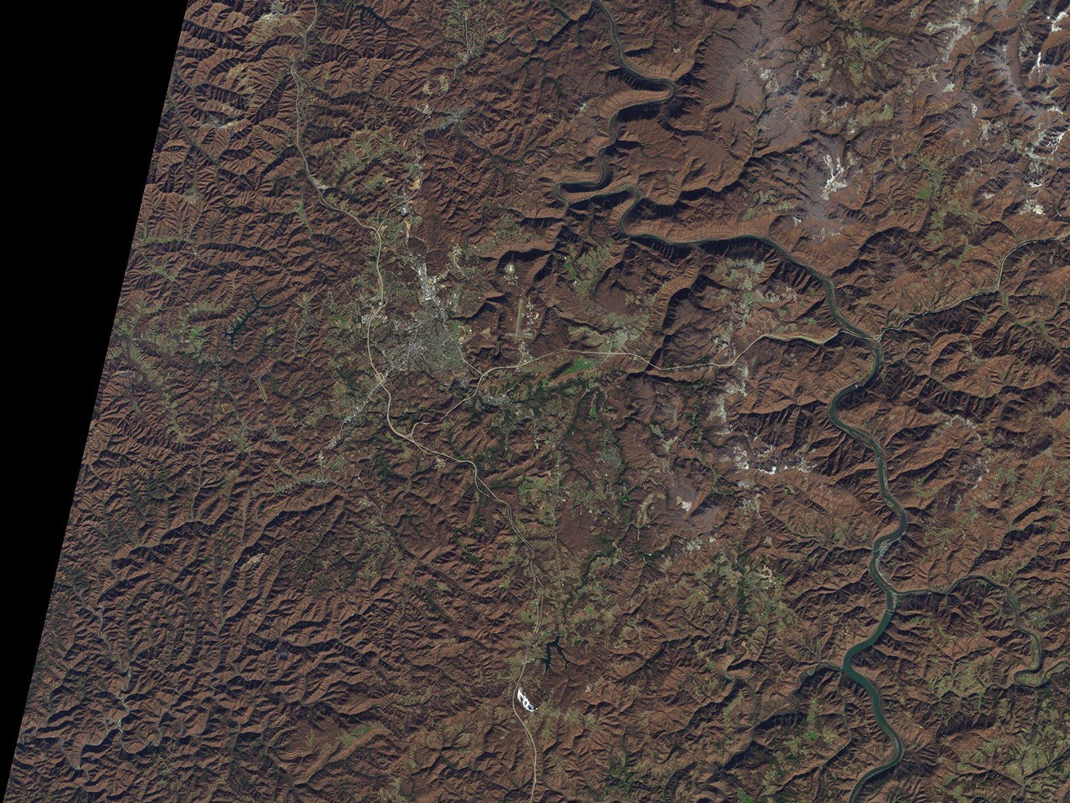 This Landsat 7 Enhanced Thematic Mapper Plus (ETM+) image (above) shows the region on December 1, 1999. The hardwood forests that cover the hills appear reddish-brown, while green vegetation fills some of the lower valleys. Dozens of creeks run through steep ravines, with small towns lining the limited flat land alongside the streams. At upper right is the town of Beckley and at lower left is Mullens, one of the most severely damaged towns.