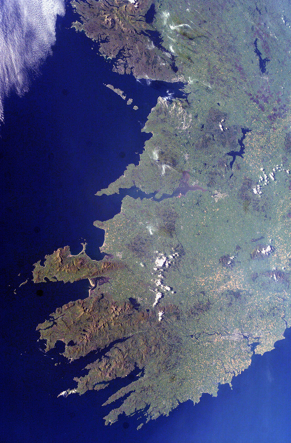 Southwestern Ireland is a popular tourist destination with scenic views of countryside and cliffs and a rich Celtic history. This broad view from the International Space Station shows the relationship between valleys, mountains, and the major towns. Near Killarney are ancient oak and yew forests. The Blarney Stone can be kissed in Blarney Castle, just north of Cork.