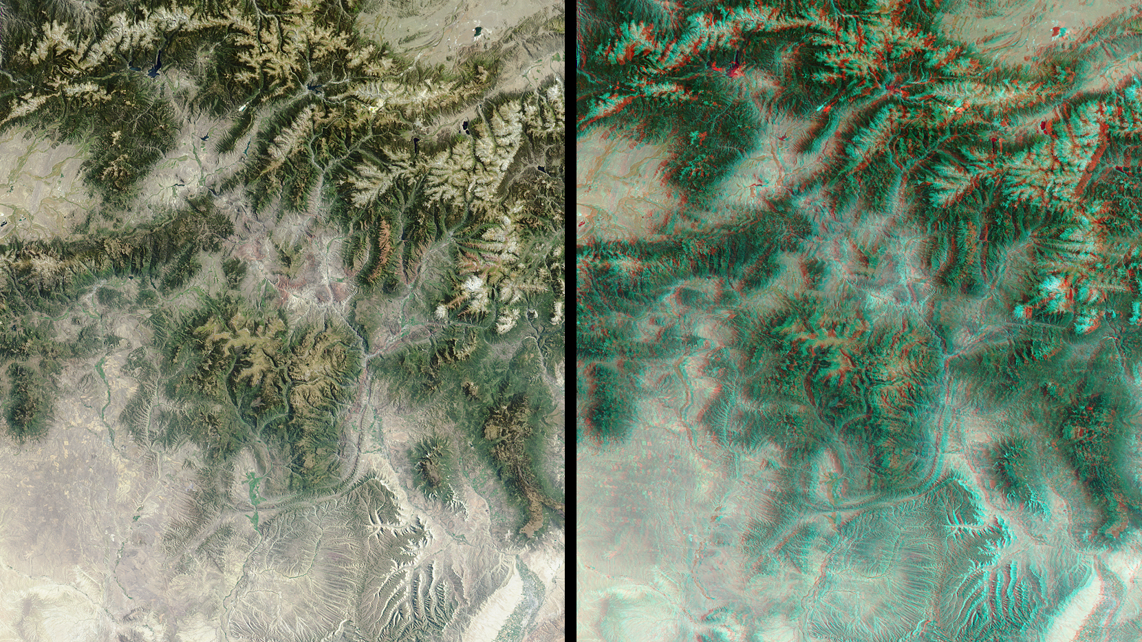 The mountains and desert plateaus of northwest Colorado are contrasted here intwo views from the Multi-angle Imaging SpectroRadiometer (MISR). On the left, anatural-color view acquired by MISR's vertical-viewing (nadir) camera illustratesthese features at a pixel resolution of 275 meters. A striking example of thecapability of multiple view angles to illustrate topography is provided bythe 3D stereo anaglyph view on the right, which was created by combining datafrom MISR's 46-degree forward-viewing and nadir cameras. To facilitate stereoviewing, both images have been oriented with north toward the left. Viewing thestereo image in 3D requires the use of red/blue glasses(http://photojournal.jpl.nasa.gov/Help/VendorList.html#Glasses) with thered filter placed over your left eye.