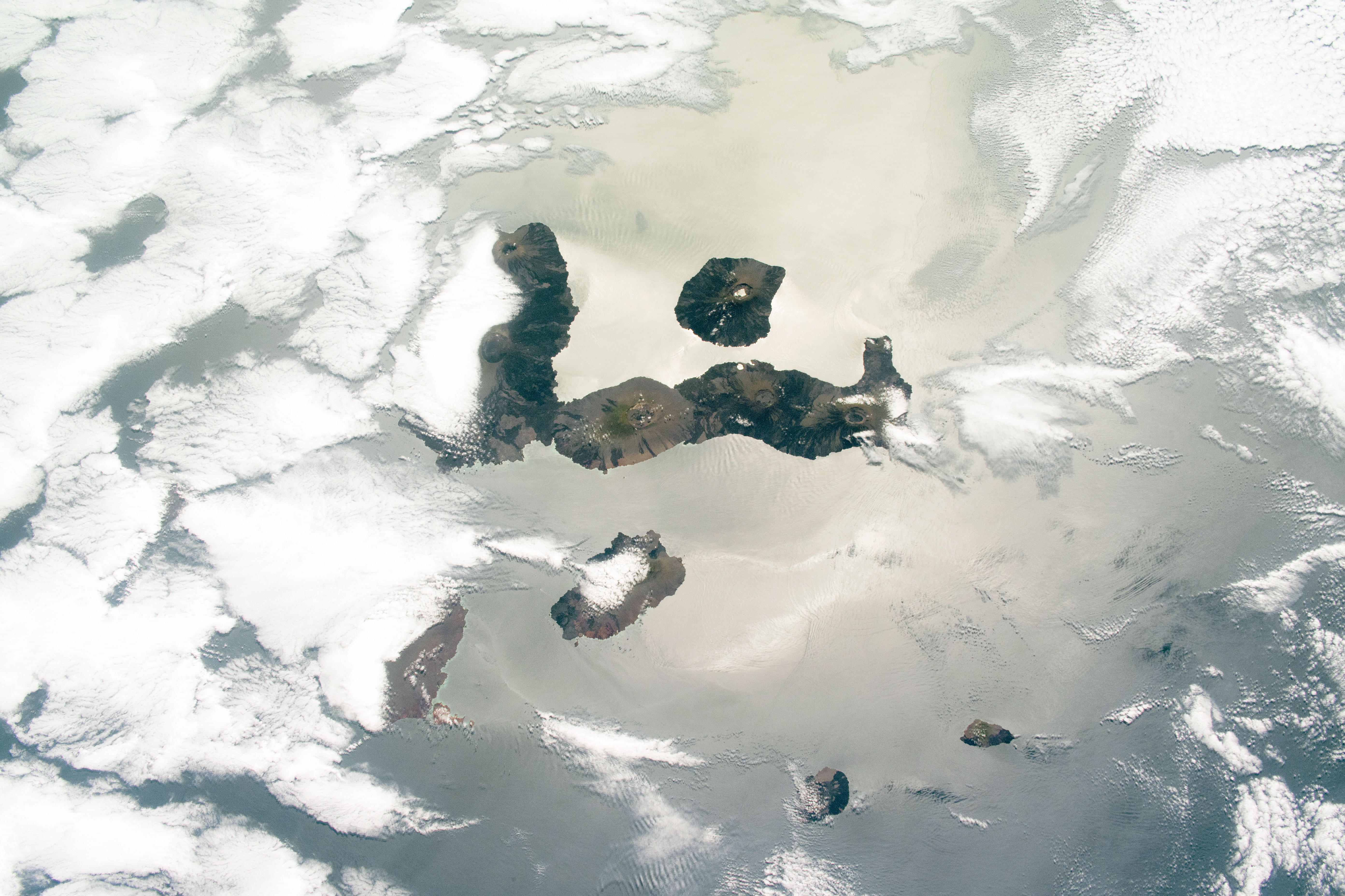 This photograph, taken by an astronaut from the International Space Station, offers a peek at several of the Galápagos Islands, visible between cloud cover and accented by sunglint on the ocean surface.