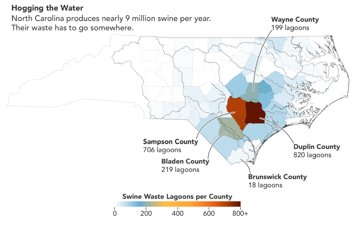 In North Carolina, there are almost as many swine as there are people. Those swine produce several million tons of manure every year, much of which gets stored and treated in outdoor “waste lagoons.”