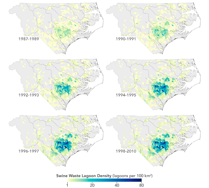That’s where satellites can help. Lise Montefiore and colleagues at North Carolina State University used the decades-long record of Landsat 5 satellite images to get a detailed view of where the lagoons are clustered, and to chronicle the historical expansion of the state’s swine farming industry. In addition to pinpointing where the waste lagoons of CAFO’s are located, the researchers also determined when they were constructed.