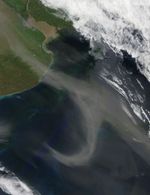 Peacock-colored, the South Atlantic Ocean was in full bloom: A display of blue and green streaks and swirls peek from beneath the dust storm. Cool currents and upwelling water along the edge of the continental shelf bring nutrient-rich water to the surface off the coast of northern Argentina. As a result, tiny plant-like organisms, phytoplankton, thrive in this part of the South Atlantic Ocean.