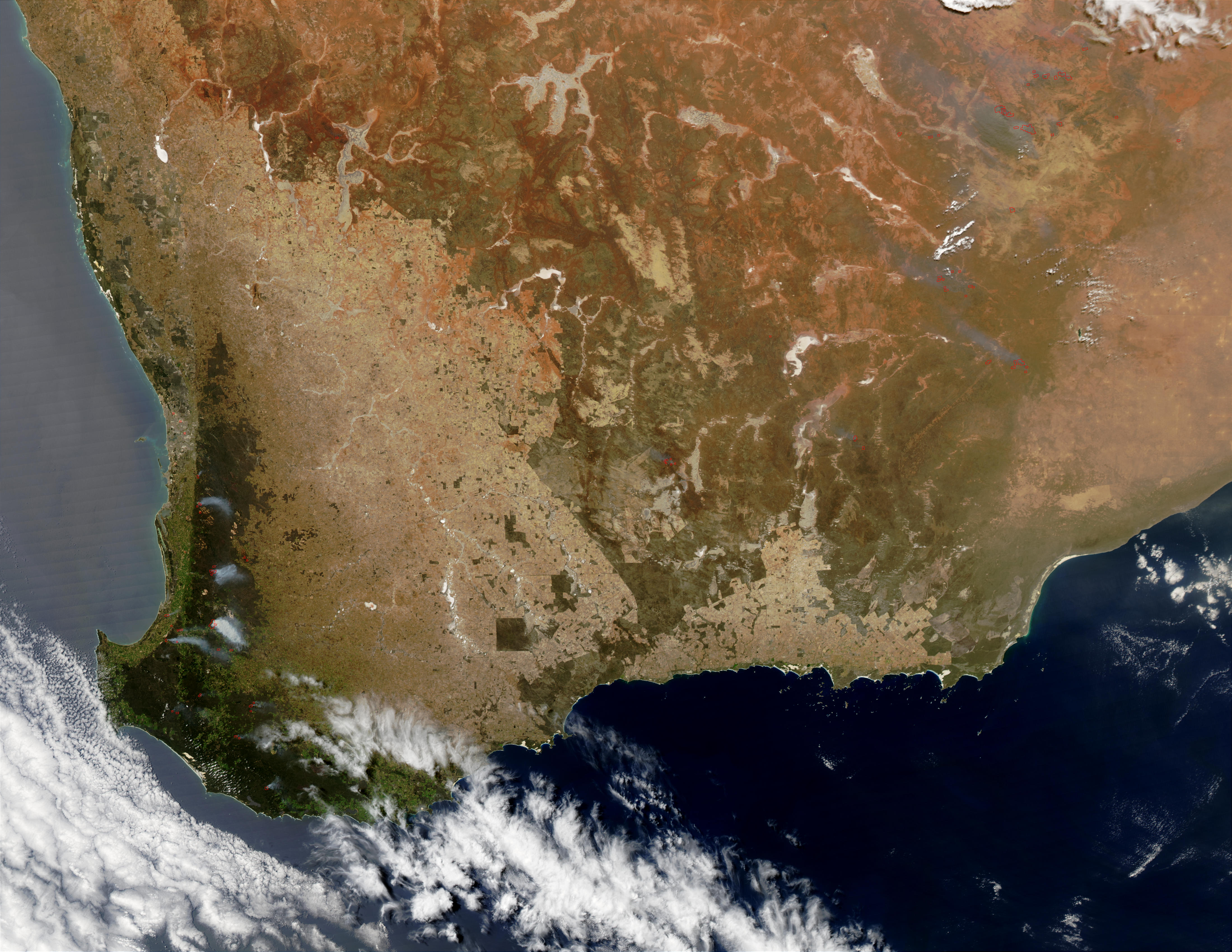 The southwest corner of Australia is no exception to the abundance of wildfires burning across the continent. On November 7, 2002, the Moderate Resolution Imaging Spectroradiometer (MODIS) on the Aqua satellite captured this image of southern Western Australia. Along the coast, the northernmost cluster of fires (red dots) appears to be burning in or near the city of Perth. Summer, with its drought-like conditions, has yet to arrive, and the region is already ablaze.