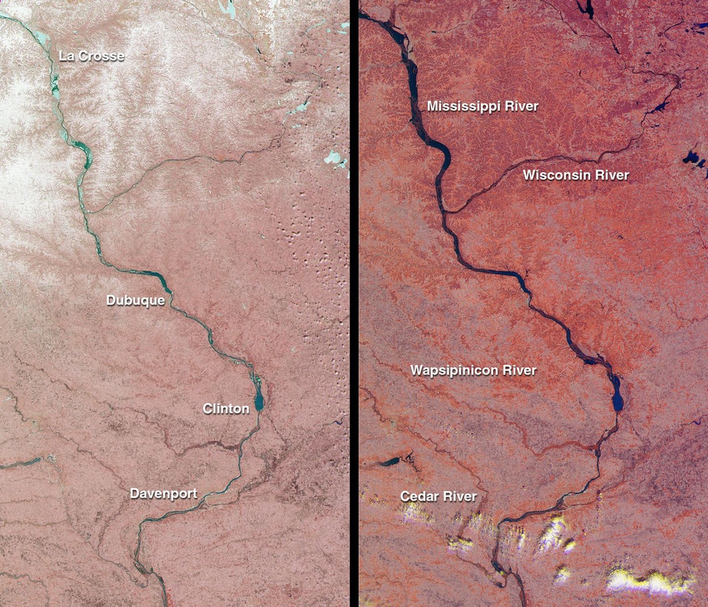 Locations of major cities are marked on the left-hand image; major rivers are marked on the right. The portion of the Mississippi River captured in these views extends from just north of La Crosse, Wisconsin to south of Davenport, Iowa. The Wisconsin River joins the Mississippi just below Prairie du Chien. On March 26, snow can clearly be seen over much of the northern portions of the left-hand image. At this point in time, the snow had already begun to melt and the Wapsipinicon River was 52 centimeters above flood stage at De Witt, Iowa (between Clinton and Davenport). By mid-April heavy rainfall swelled the Mississippi and Wisconsin rivers. In the early morning of April 25, two days before the right-hand image was acquired, the Mississippi River crested in Davenport, Iowa at 680 centimeters, slightly below the level reached in the record-setting flood of 1993.