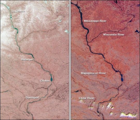 Locations of major cities are marked on the left-hand image; major rivers are marked on the right. The portion of the Mississippi River captured in these views extends from just north of La Crosse, Wisconsin to south of Davenport, Iowa. The Wisconsin River joins the Mississippi just below Prairie du Chien. On March 26, snow can clearly be seen over much of the northern portions of the left-hand image. At this point in time, the snow had already begun to melt and the Wapsipinicon River was 52 centimeters above flood stage at De Witt, Iowa (between Clinton and Davenport). By mid-April heavy rainfall swelled the Mississippi and Wisconsin rivers. In the early morning of April 25, two days before the right-hand image was acquired, the Mississippi River crested in Davenport, Iowa at 680 centimeters, slightly below the level reached in the record-setting flood of 1993.