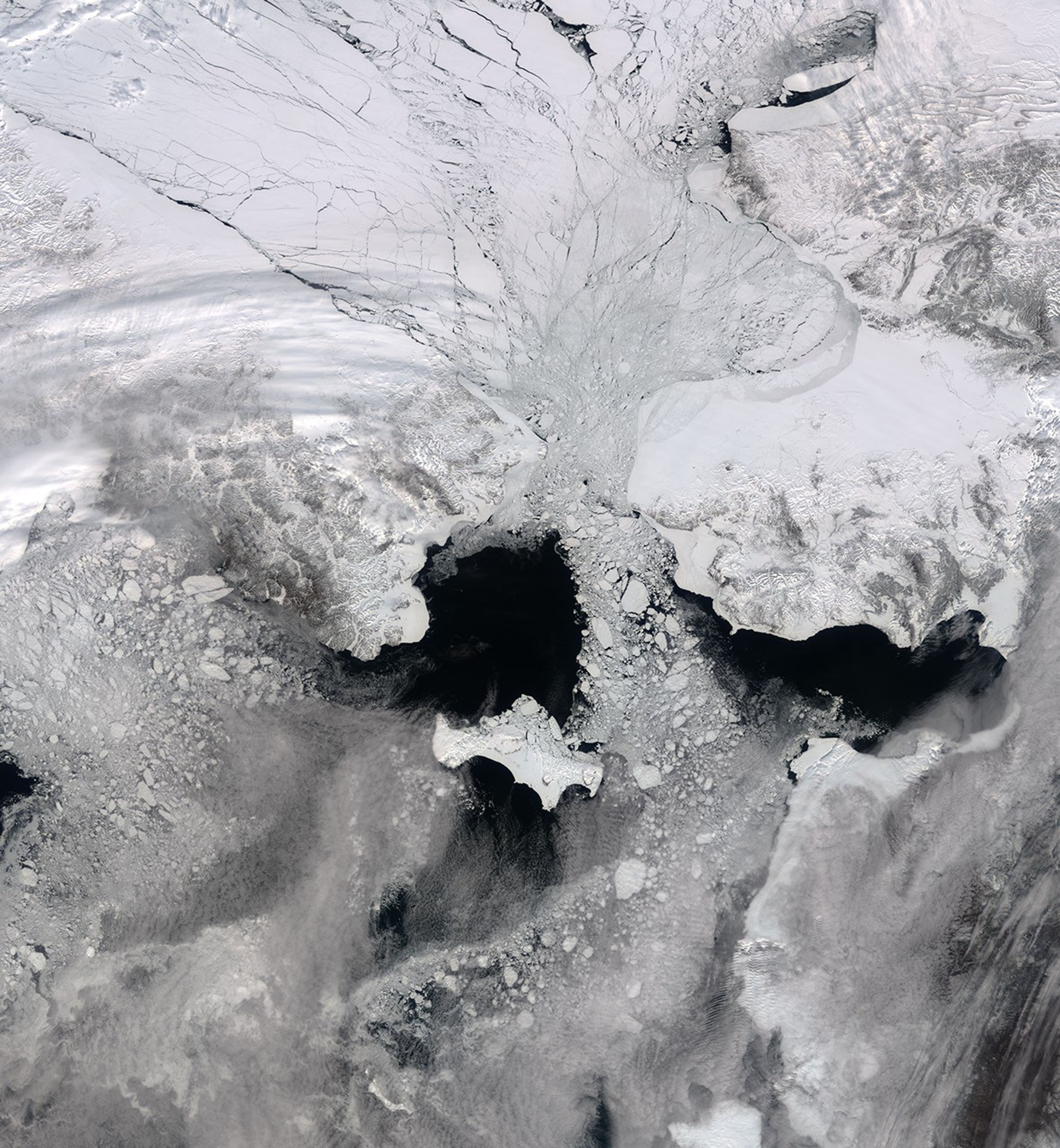 MODIS image of the Bering Sea, Bering Strait and southern Arctic Ocean acquired 7 May 2000. Image generated from MODIS band 2 (0.85 µm) at 250 m spatial resolution. Detailed structure and leads in the ice pack are apparent. Ice flow from the Bering Strait southward to the Bering Sea is seen in great detail.
