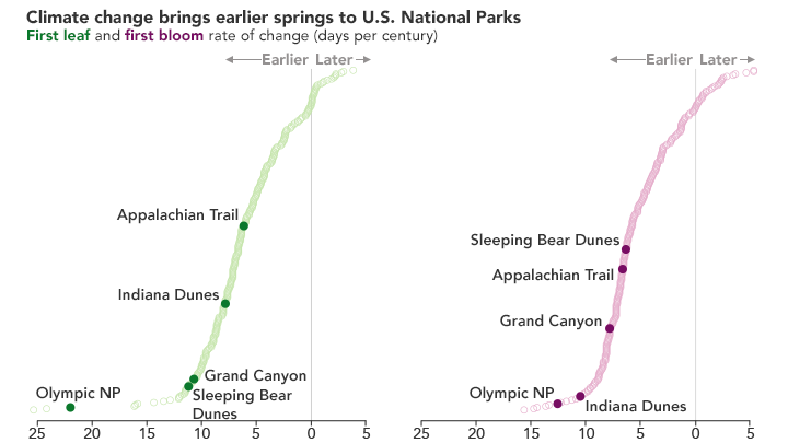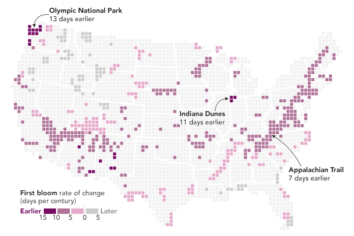Still other parks, such as Olympic National Park, are both blooming and leafing out earlier than normal. Conversely, some areas of the southeastern United States are not seeing much change at all; that region experienced less warming in the second half of the 20th Century.