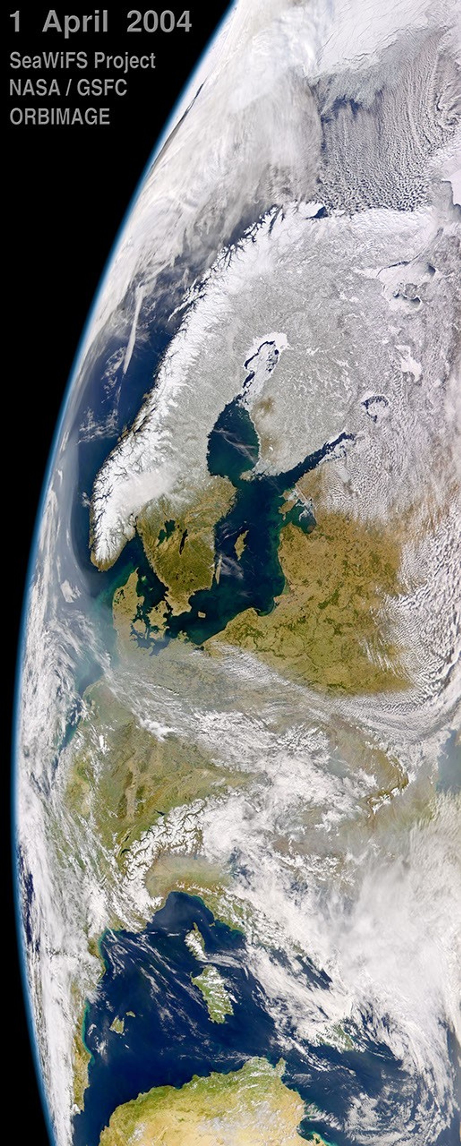 April 1, 2004, was a sunny spring day for most of Scandinavia and the Baltic States, though a region of hazy air lurked offshore to the west and to the south. The cloud-free skies gave the Sea-viewing Wide Field-of-view Sensor (SeaWiFS) on the OrbView-2 satellite a clear view of the Baltic region. On the left, the lingering snow highlights the varied geology of the Scandinavian Peninsula. The thick snow that clings to Norway’s mountains provides a stark contrast to the dark fingers of water, fjords, that cut into the land, making it appear even more formidable. To the east, the snow has largely melted, remaining only in Sweden’s northern highlands. The forests of the south are bringing hints of green to the winter-brown land.