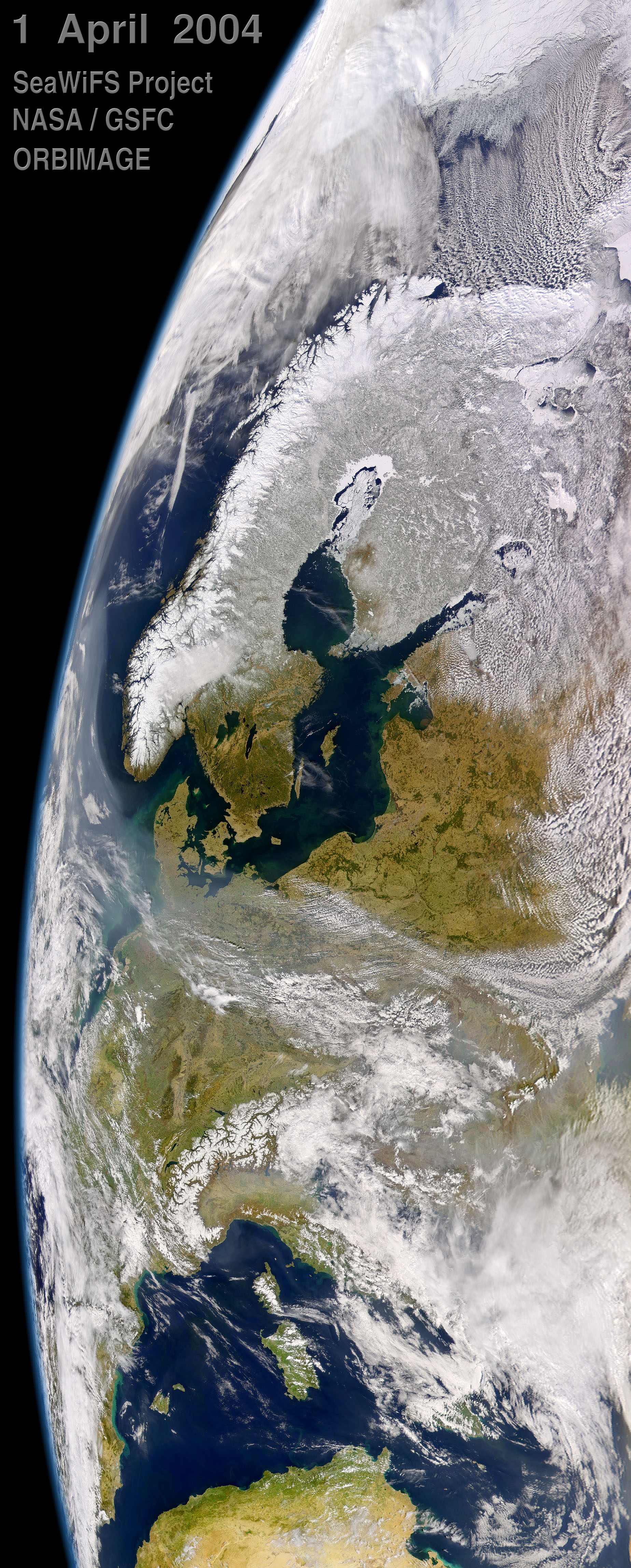 April 1, 2004, was a sunny spring day for most of Scandinavia and the Baltic States, though a region of hazy air lurked offshore to the west and to the south. The cloud-free skies gave the Sea-viewing Wide Field-of-view Sensor (SeaWiFS) on the OrbView-2 satellite a clear view of the Baltic region. On the left, the lingering snow highlights the varied geology of the Scandinavian Peninsula. The thick snow that clings to Norway’s mountains provides a stark contrast to the dark fingers of water, fjords, that cut into the land, making it appear even more formidable. To the east, the snow has largely melted, remaining only in Sweden’s northern highlands. The forests of the south are bringing hints of green to the winter-brown land.