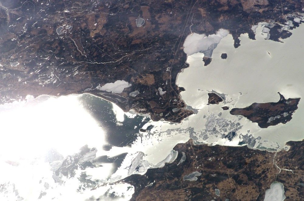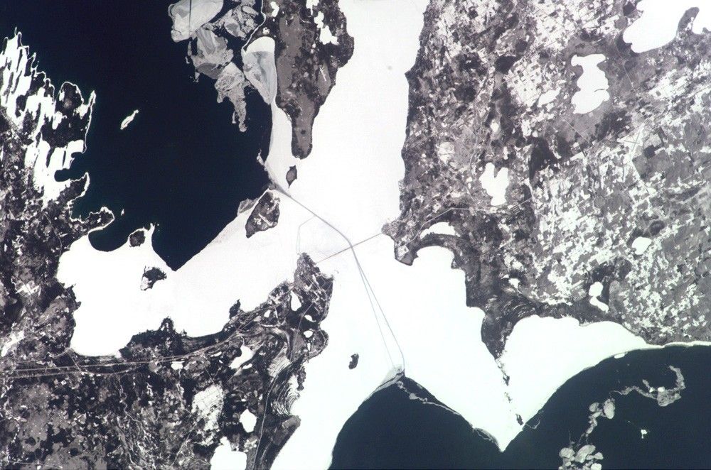 This pair of images shows the Mackinac Straits while they were still frozen (top) and as they began to thaw (below). The March 22 view shows shipping lanes opened by ice breakers. A narrow passage connects the cleared shipping channel to the small town of St. Ignace at the north end of the bridge (Mackinaw City appears at the south end). The April view shows the ice broken into a series of irregular rafts that appear gray against bright water. The whitish appearance of the water is not snow or ice, but instead is sunlight glinting off the water back to camera. The shipping channel is maintained even through remnants of the ice mass, but the ice ridges can be hazardous to shipping until the last of the ice breaks up.