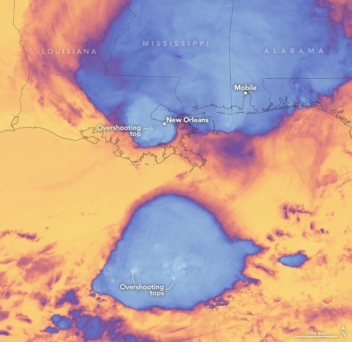 Bedka noted that the storm over Louisiana was a small, isolated severe storm cell. In contrast, the larger storm complex to the south, which displayed numerous overshooting tops, appeared to be a mesoscale convective system.