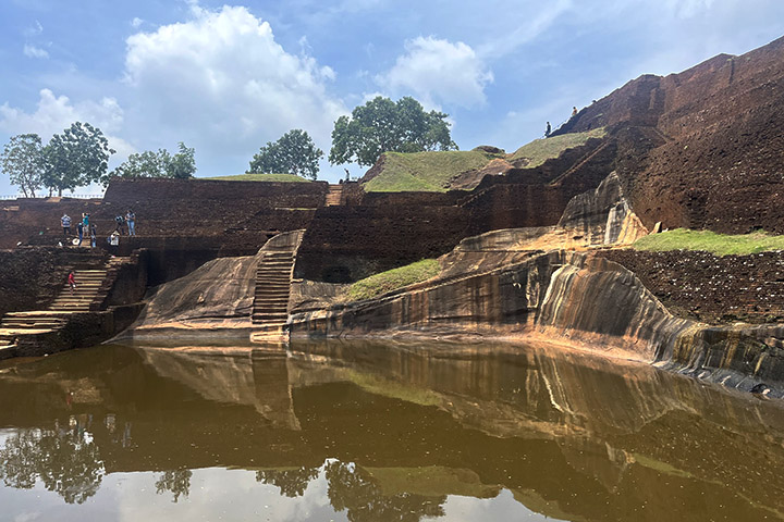 Fifth-century king Kasyapa had a palace and fortress built on Sigirya’s relatively flat summit, along with a protective moat and an expansive water garden at the base. With as many as one million visitors each year, Sigiryia is one of Sri Lanka’s best-known historical sites. It was declared a UNESCO World Heritage Site in 1982. The photograph above shows the inselberg seen from the water garden. The photograph below shows ruins on the summit.