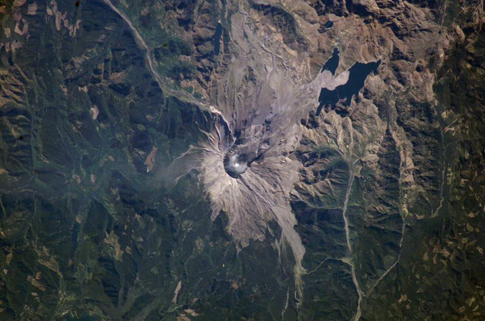 Early in October 2004 Mt. St. Helens rumbled back to life with earthquakes, minor eruptions of steam and ash, and renewed growth of the summit lava dome. Fortuitous trajectories of the International Space Station provided the ISS crew excellent views of the area, and they proceeded to collect a suite of images of Mount St. Helens over several days from different vantage points. This south-viewing image was acquired on October 13, 2004 following recent steam eruptions; two white steam plumes are visible to the south of the summit dome. While lava dome growth continues the current eruptive activity has not significantly altered the morphology of the volcano. Several mudflows and deposition of minor amounts of ash close to the cone have occurred as a result of current activity.