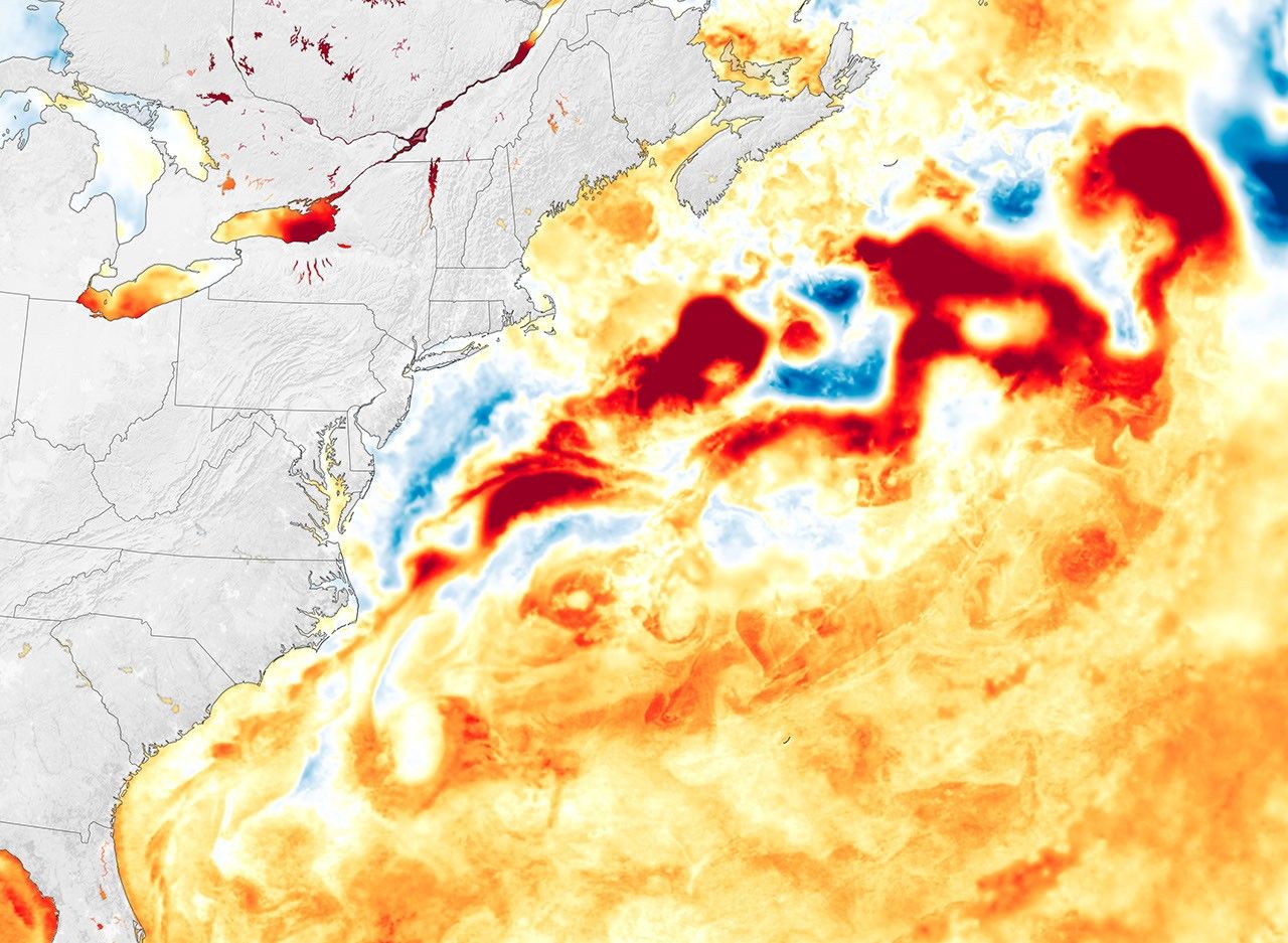 The map above shows sea surface temperature anomalies for May 19, 2022, across the northwest Atlantic Ocean. It depicts how much the surface layer was above or below the long-term average temperature for this time of year. The data come from the Multiscale Ultrahigh Resolution Sea Surface Temperature (MUR SST) project, based at NASA’s Jet Propulsion Laboratory. MUR SST blends measurements of sea surface temperatures from multiple NASA, NOAA, and international satellites, as well as ship and buoy observations.