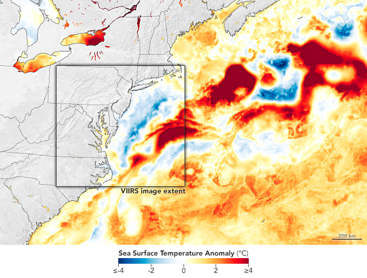 NASA Earth Observatory images by Joshua Stevens , using VIIRS data from NASA EOSDIS LANCE , GIBS/Worldview , and the Joint Polar Satellite System (JPSS), and data from the Multiscale Ultrahigh Resolution (MUR) project. Story by Michael Carlowicz , with image interpretation from Oscar Schofield, Michael Crowley, and Robert Chant of Rutgers University and Chris Gobler of Stony Brook University. .