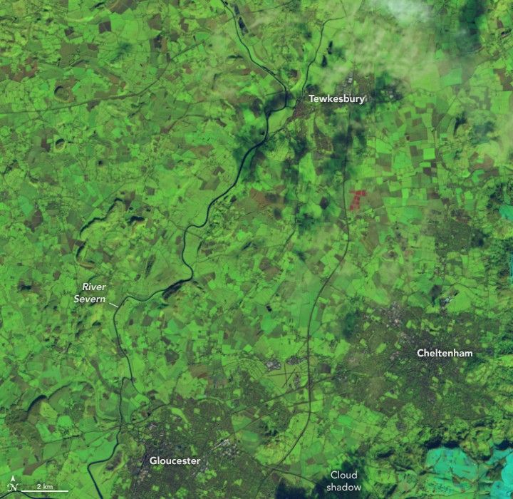 England’s Midlands were some of the worst-hit by the storm, including along the River Severn. The image above (right) shows water overtopping the banks of the Severn near Gloucester on January 3. Hundreds of properties located near the Severn in the West Midlands flooded during the storm, according to news reports. For comparison, the image on the left shows the same area on January 30, 2019. Both images were acquired by the OLI (Operational Land Imager) on Landsat 8 and are false color to emphasize the presence of water, which appears in shades of blue.
