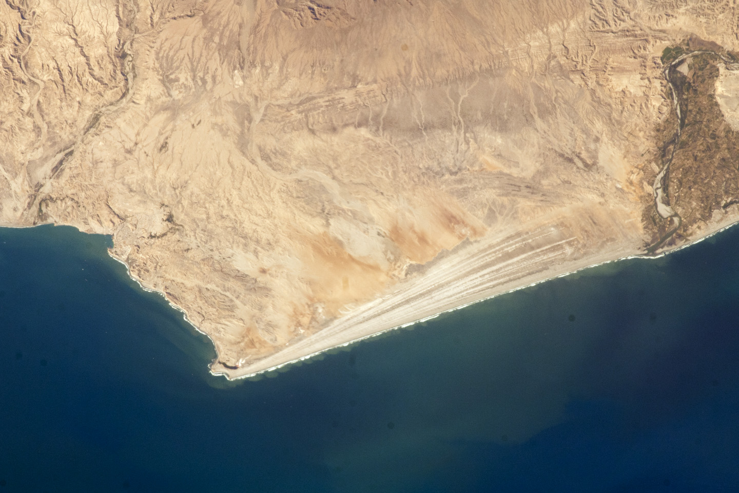 The scale and orientation of landscape features that are difficult to see from the ground often become readily visible from orbit. Numerous subparallel lines along the arid, northern coast of Peru are close-packed beach ridges, known collectively as a strandplain. (For scale, the strandplain is 30 kilometers long.) Each ridge shows the position of a prior shoreline. The Chira River delta appears at image right, with dark green agricultural fields occupying the area. A smaller river reaches the sea, without forming a delta, at image left. The prominent cape at lower left is Punta Balcones, a region with many oil wells.