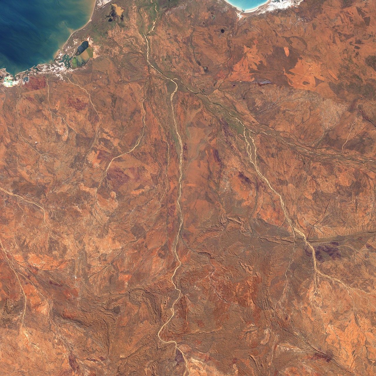 One place that may help paleontologists answer their questions about very early life on Earth is the Strelley Pool Chert rock formation in the Pilbara region of Western Australia. This picture is a composite of images acquired by the Landsat-7 satellite on May 19, 2000 (in the north), and June 23, 2001 (in the south). The Pilbara region sees hot temperatures and little rain, and its terrain is rugged, evidenced by the many creases and networks of hills meandering through the area. The Shaw River channel runs through the middle of the image. The Strelley Pool Chert rock formation appears near the bottom of the image, on the east side of the river.