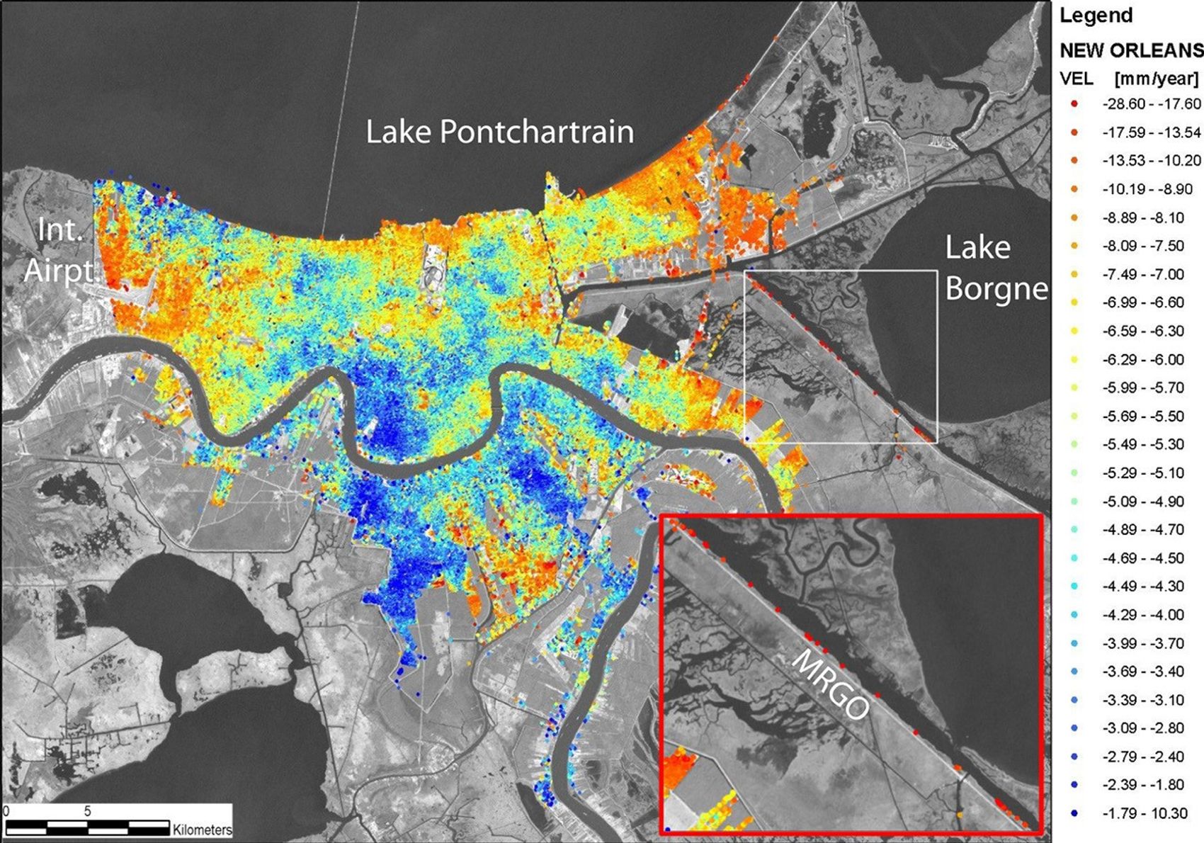 Most people know that New Orleans has been sinking, but exactly how much has it sunk? In a paper published in the journal Nature, an international team of scientists determined the subsidence (sinking) in New Orleans in the three-year period prior to Hurricane Katrina. The team used data collected by Canada’s RADARSAT satellite between April 2002 and July 2005. The researchers found that most of New Orleans subsided 8 millimeters per year relative to global mean sea level during that period.