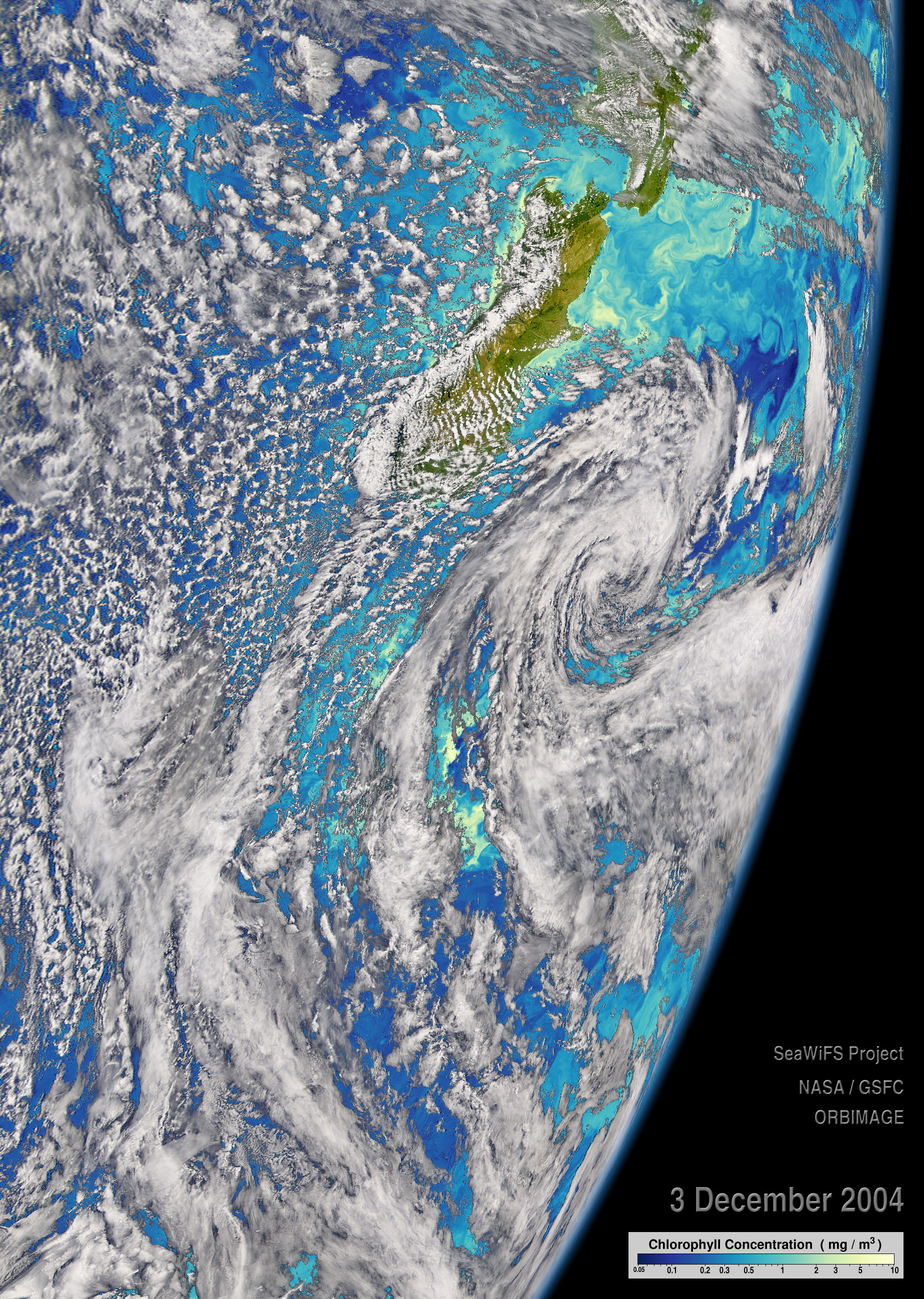This Sea-viewing Wide Field-of-view Sensor (SeaWiFS) image collected on December 3, 2004, shows phytoplankton (microscopic ocean plants) blooms along the ocean circulation feature called the Subtropical Front to the east of New Zealand. The waters of the Pacific Ocean around New Zealand are colored to represent the concentration of chlorophyll in milligrams per cubic meter of water. The scale ranges from shades of deep blue, where little or no chlorophyll was detected by SeaWiFS, to yellow, where the highest concentrations of chlorophyll were detected.