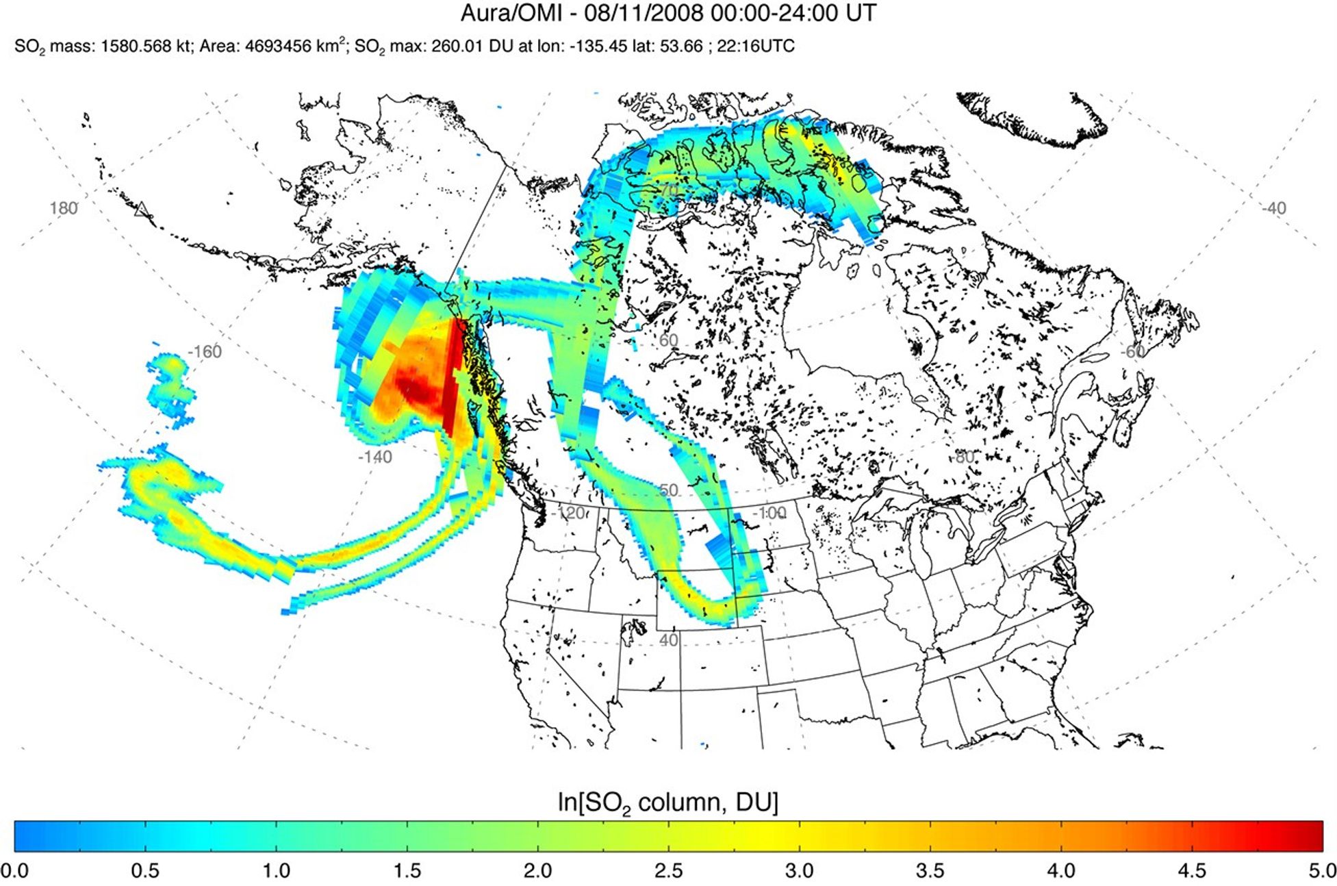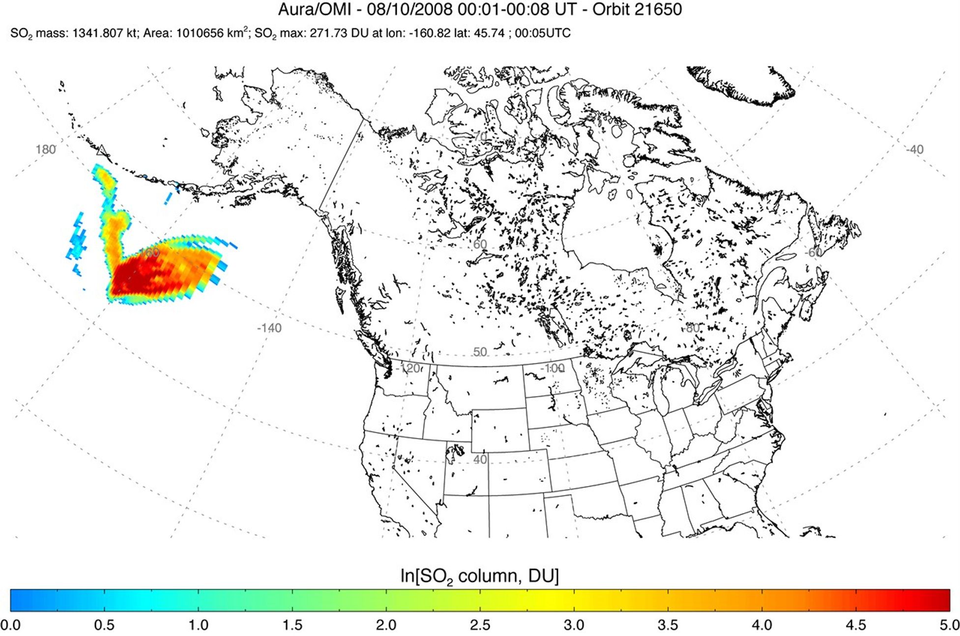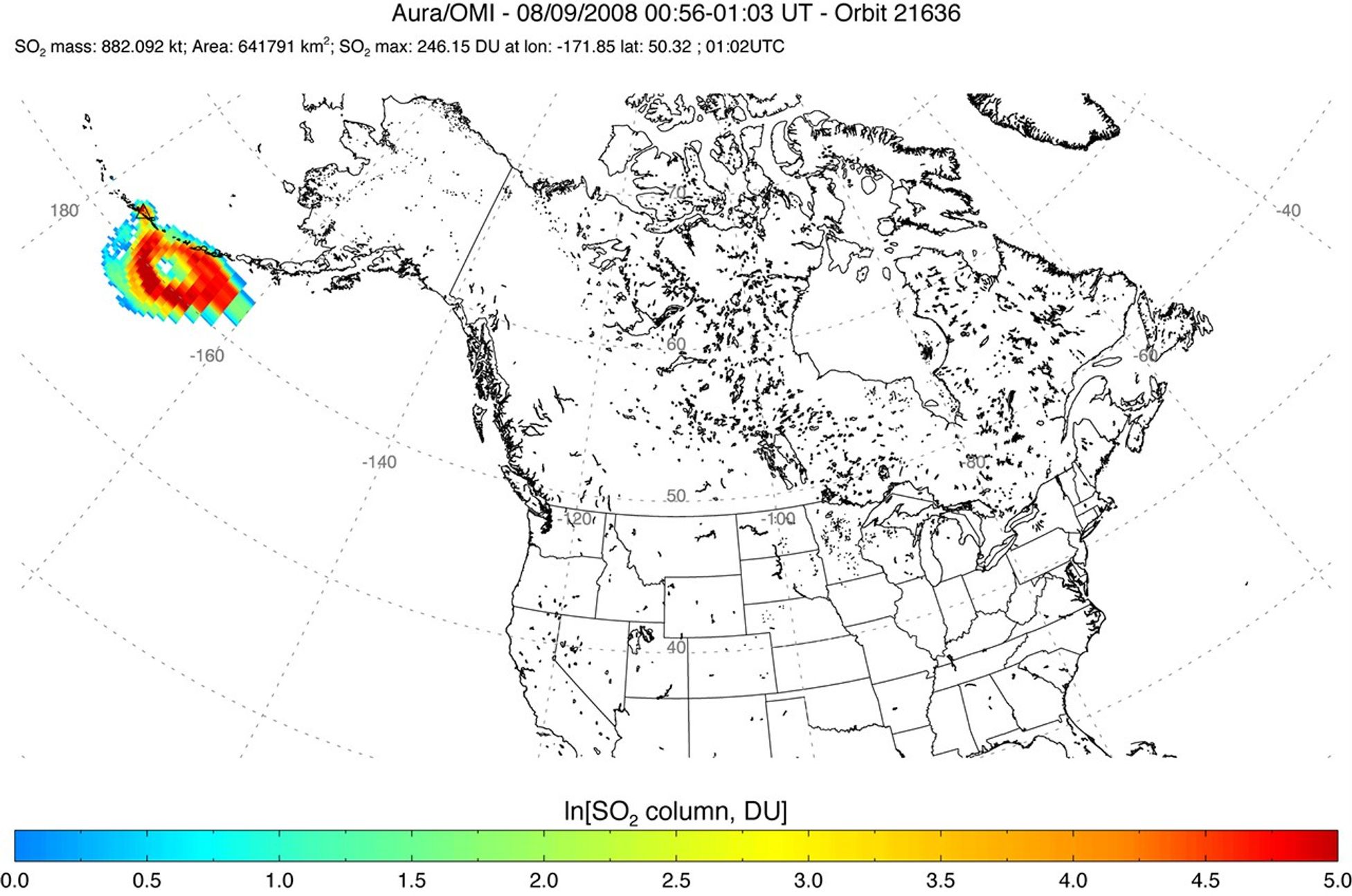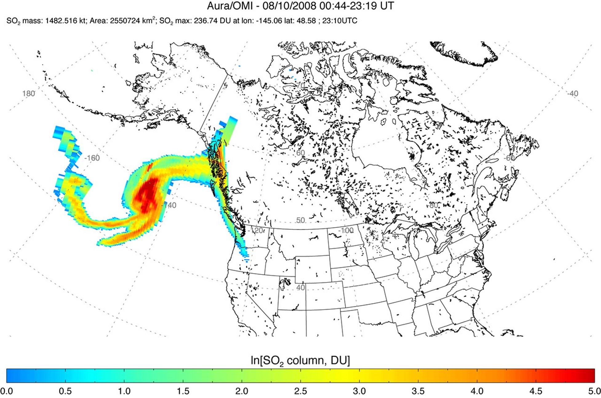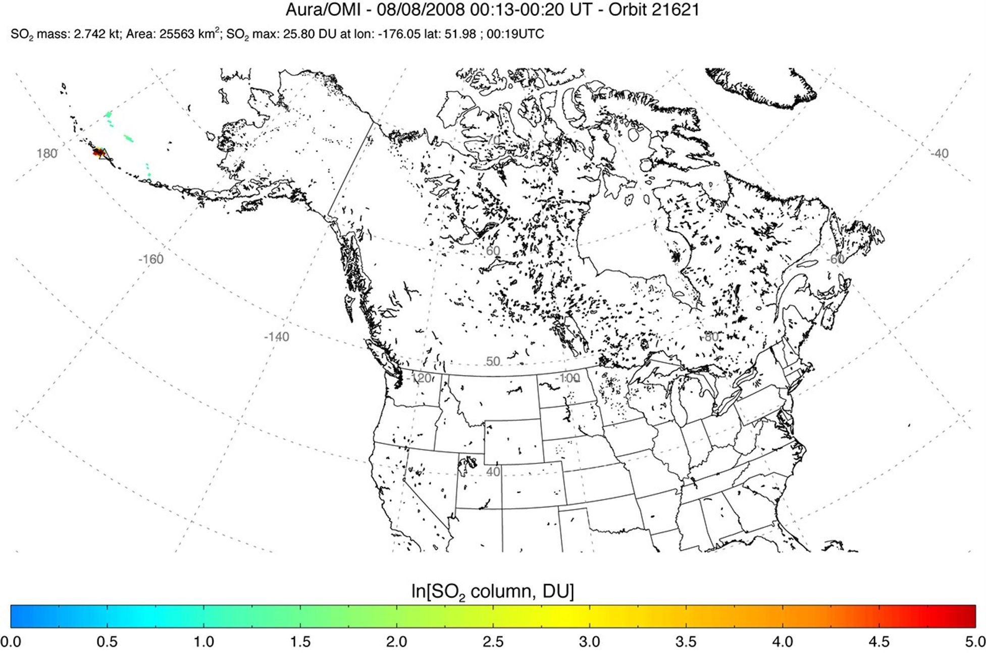 OMI captured this image on August 10, 2008. By this time, the sulfur dioxide cloud had traveled southeast toward the Canadian-United States border. The most densely concentrated portion of the cloud, containing up to 105 Dobson Units of sulfur dioxide, is dark red. A Dobson Unit is a measure of the concentration of the gas in a 15-kilometer tall column of the atmosphere. If you could compress all the sulfur dioxide in that column of the atmosphere into a flat layer at the Earth’s surface (at 0 degrees Celsius), one Dobson Unit of the gas would be 0.01 millimeters thick, and it would contain 0.0285 grams of sulfur dioxide per square meter. Lesser, though still significant amounts of sulfur dioxide trail behind the cloud from the volcano and arch forward into Canada and Washington. (Note that the scales on the large images are logarithmic, showing the natural log of column sulfur dioxide concentration in Dobson Units.)