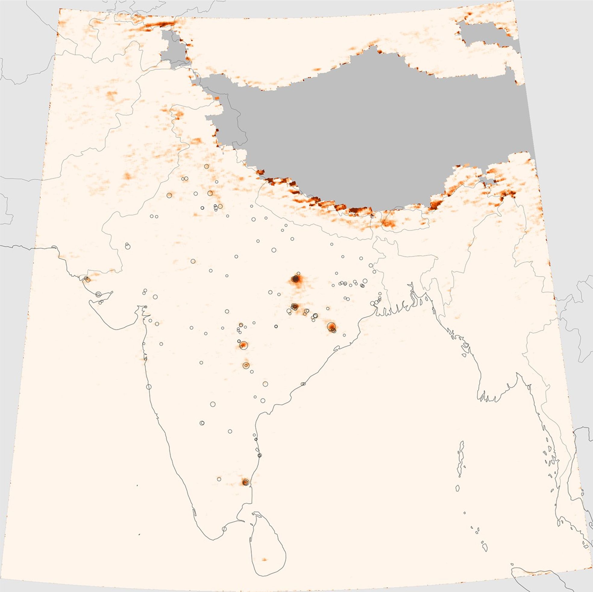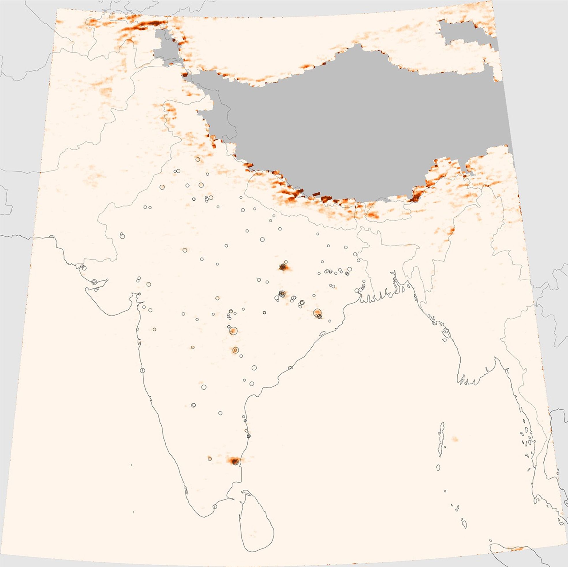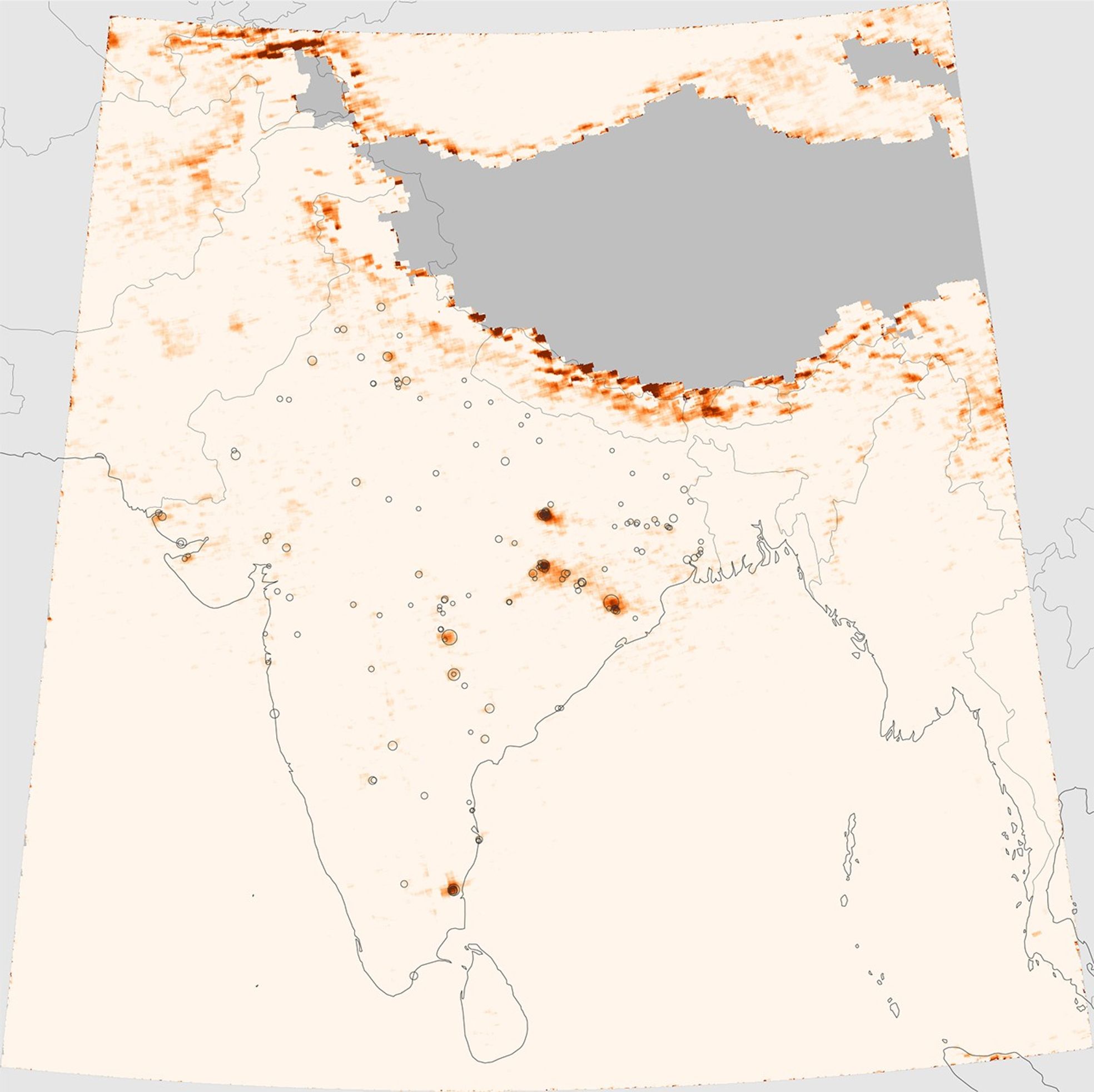 The maps above depict sulfur dioxide concentrations in 2011-12 (top) and 2005 (lower) and the relative size of power plants in India. Darker shades of orange-brown depict greater concentrations of SO2 in the atmosphere, while the size of the circles indicates the amount of emissions from the local power plant smoke stacks. Turn on the image comparison tool for a better look at the difference. You can also download maps of measurements for each year between 2005 and 2012.