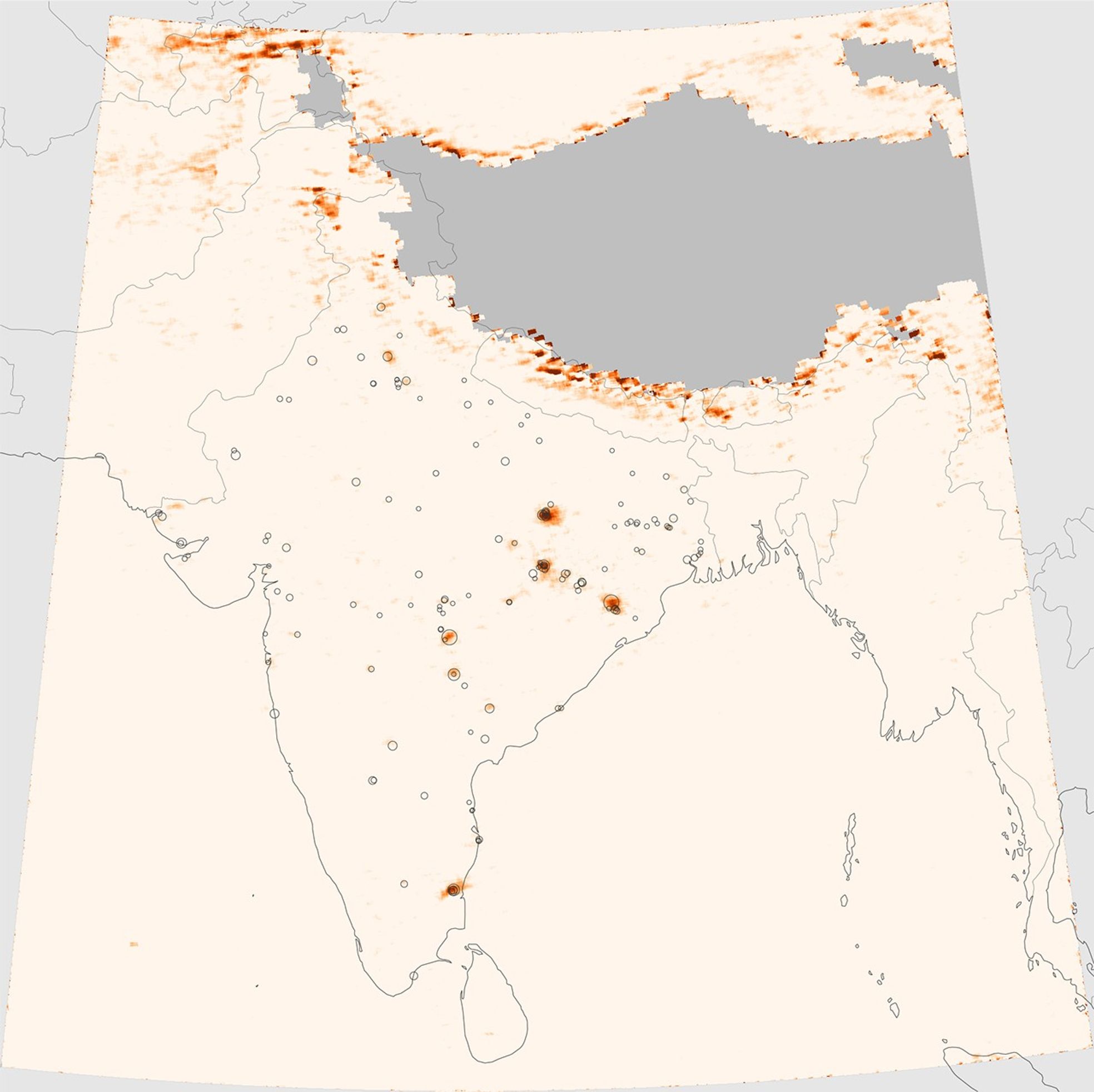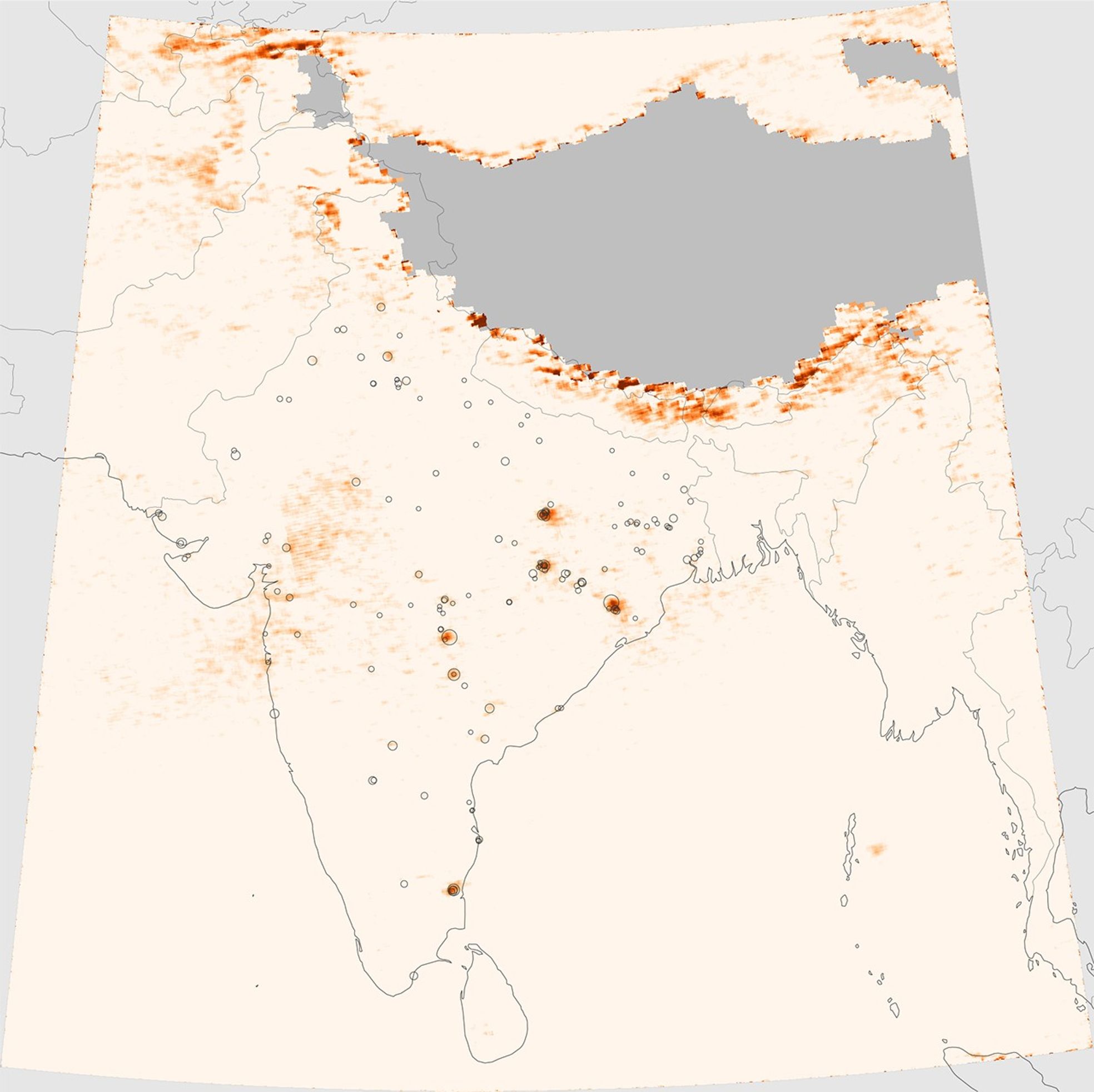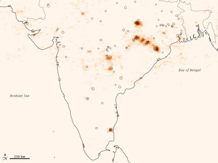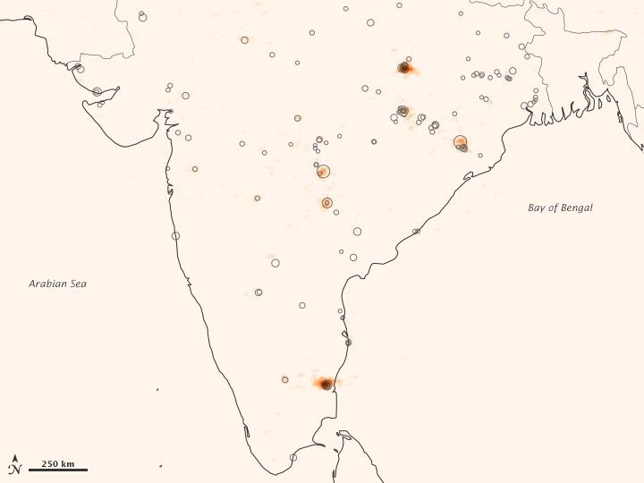 The maps above depict sulfur dioxide concentrations in 2011-12 (top) and 2005 (lower) and the relative size of power plants in India. Darker shades of orange-brown depict greater concentrations of SO2 in the atmosphere, while the size of the circles indicates the amount of emissions from the local power plant smoke stacks. Turn on the image comparison tool for a better look at the difference. You can also download maps of measurements for each year between 2005 and 2012.
