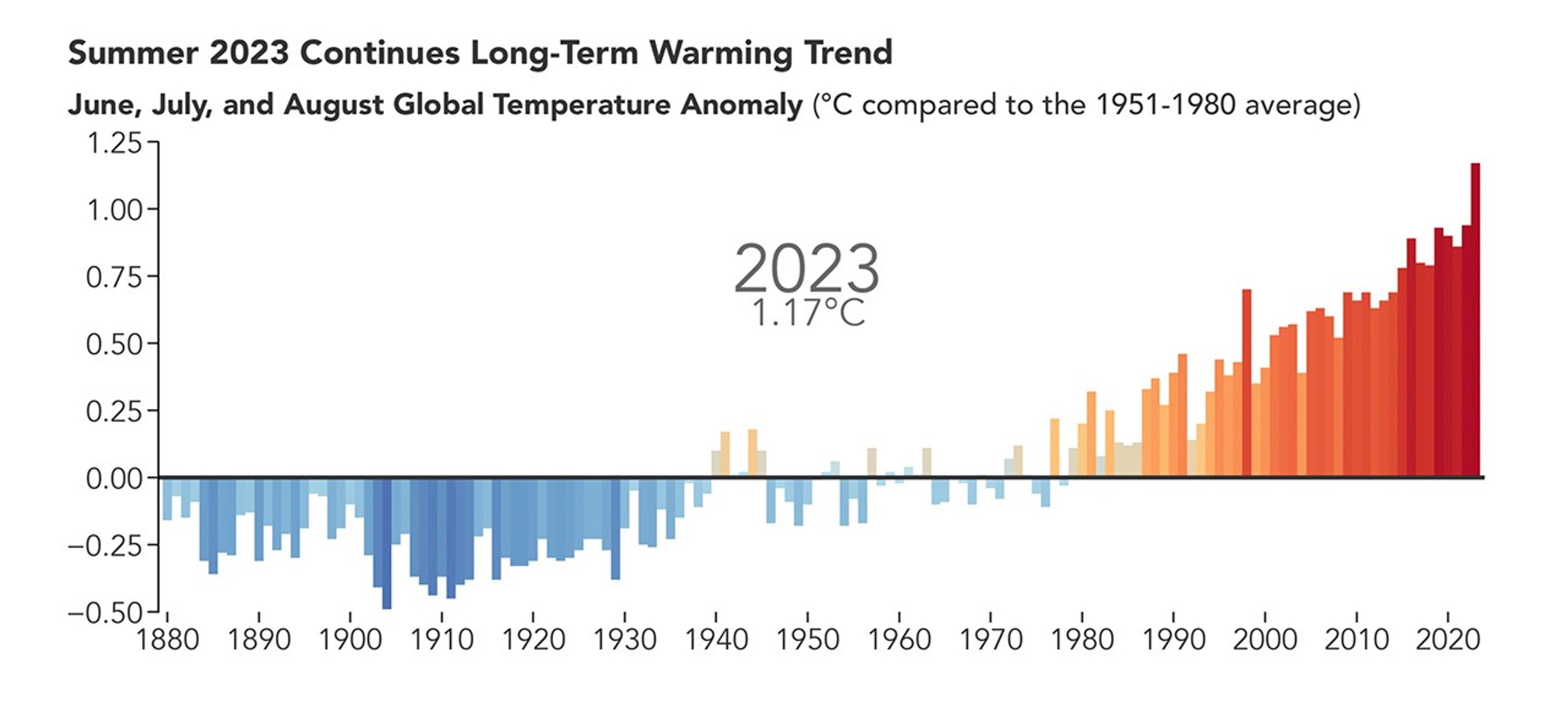 The map above depicts global temperature anomalies for June, July, and August 2023. It shows how much warmer or cooler Earth was compared to the baseline average from 1951 to 1980. Note that the deepest reds are at least 4°C (7°F) above the mean.